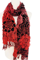 This Long Scarf is a dramatic textured wrap patterned with red floral motifs on a black ground and finished with fringe. Patricia's Presents designed the piece with a layered, almost three-dimensional knit that adds tactile interest to coats and evening looks. Lightweight yet substantial, it can be draped, looped, or worn as a shawl for added warmth and style. Scarf is 6" long with fringe.