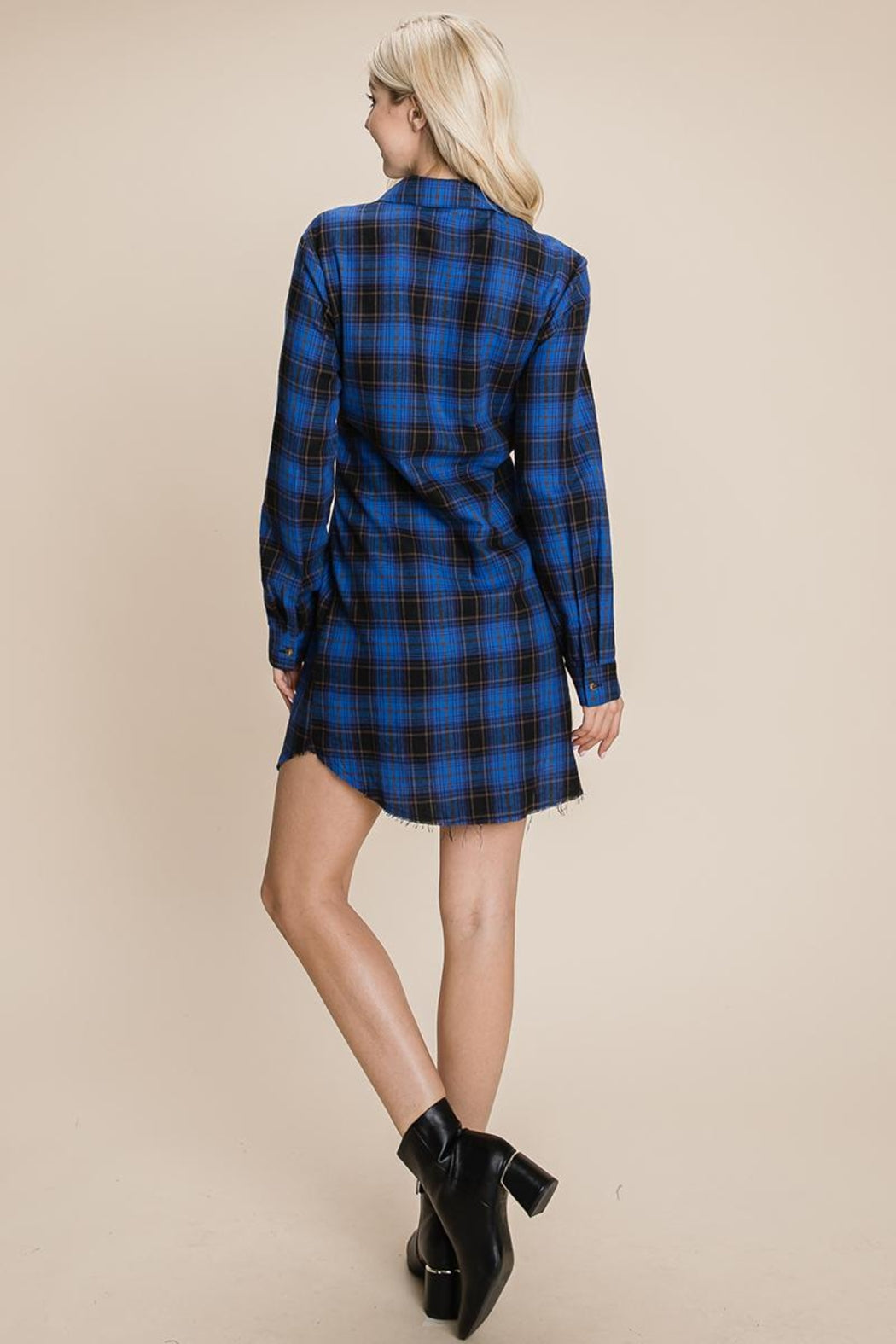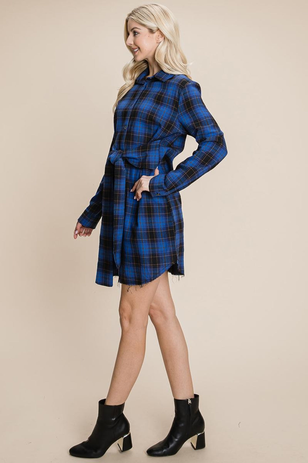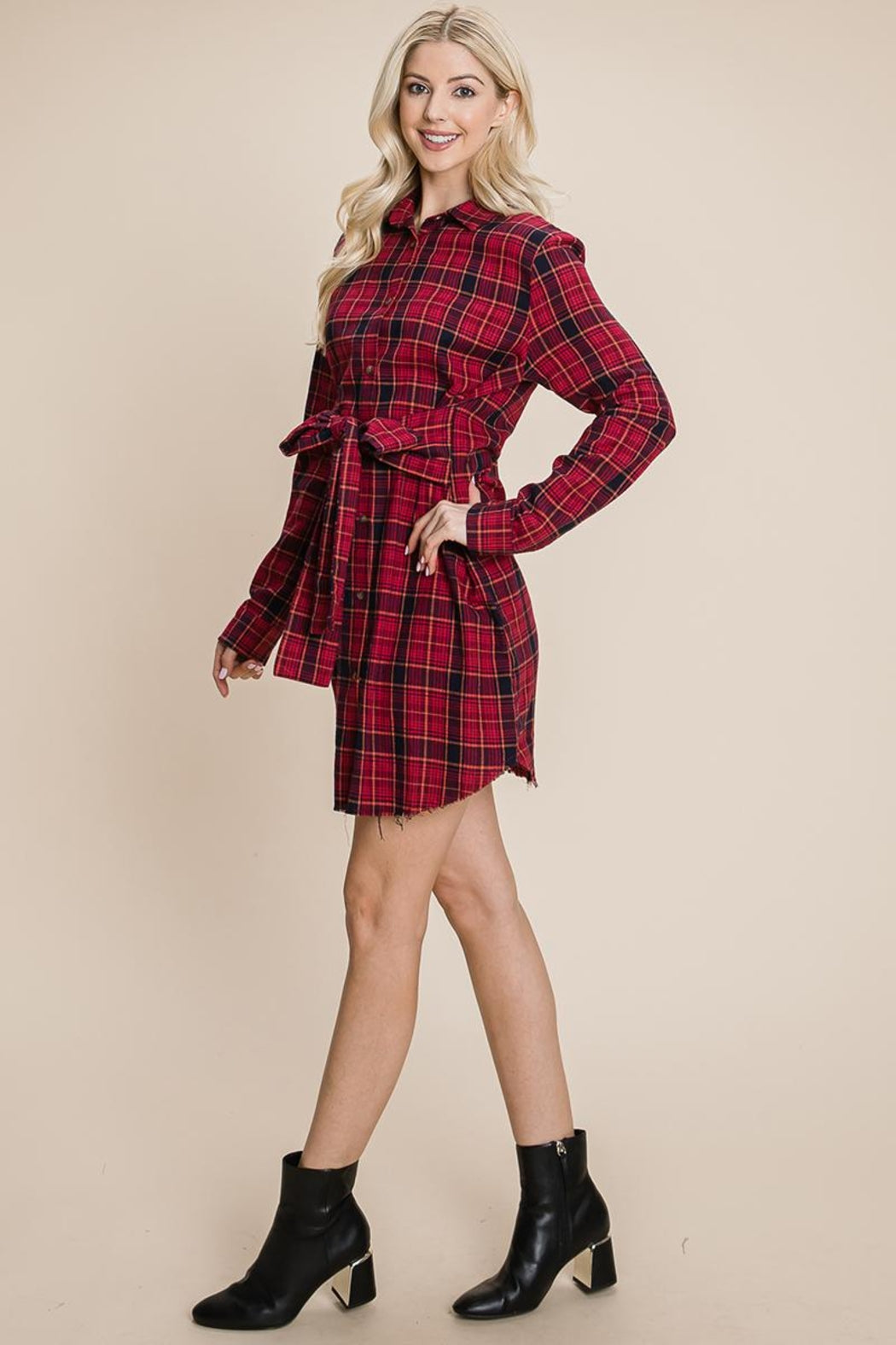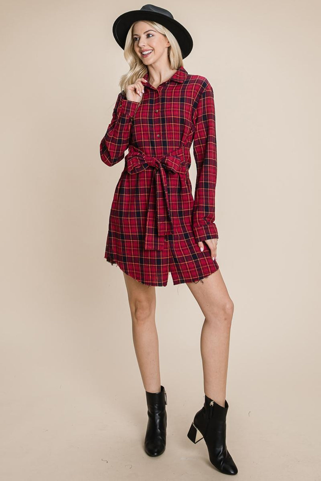 Features: long sleeve shirt dress, collar, button down, self belted, plaid pattern