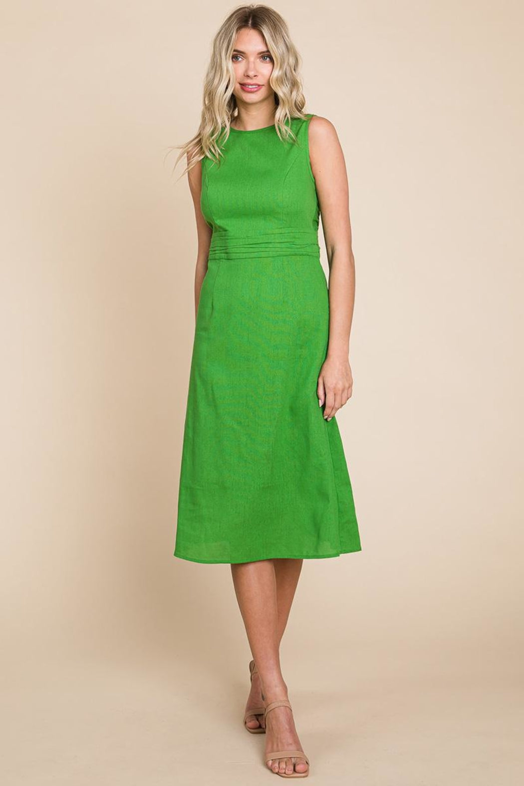 Features: Sleeveless, Back Keyhole, Tied Backless, Boat Neck, Pleated Waist, Hidden Side Zipper Closure, Midi Length