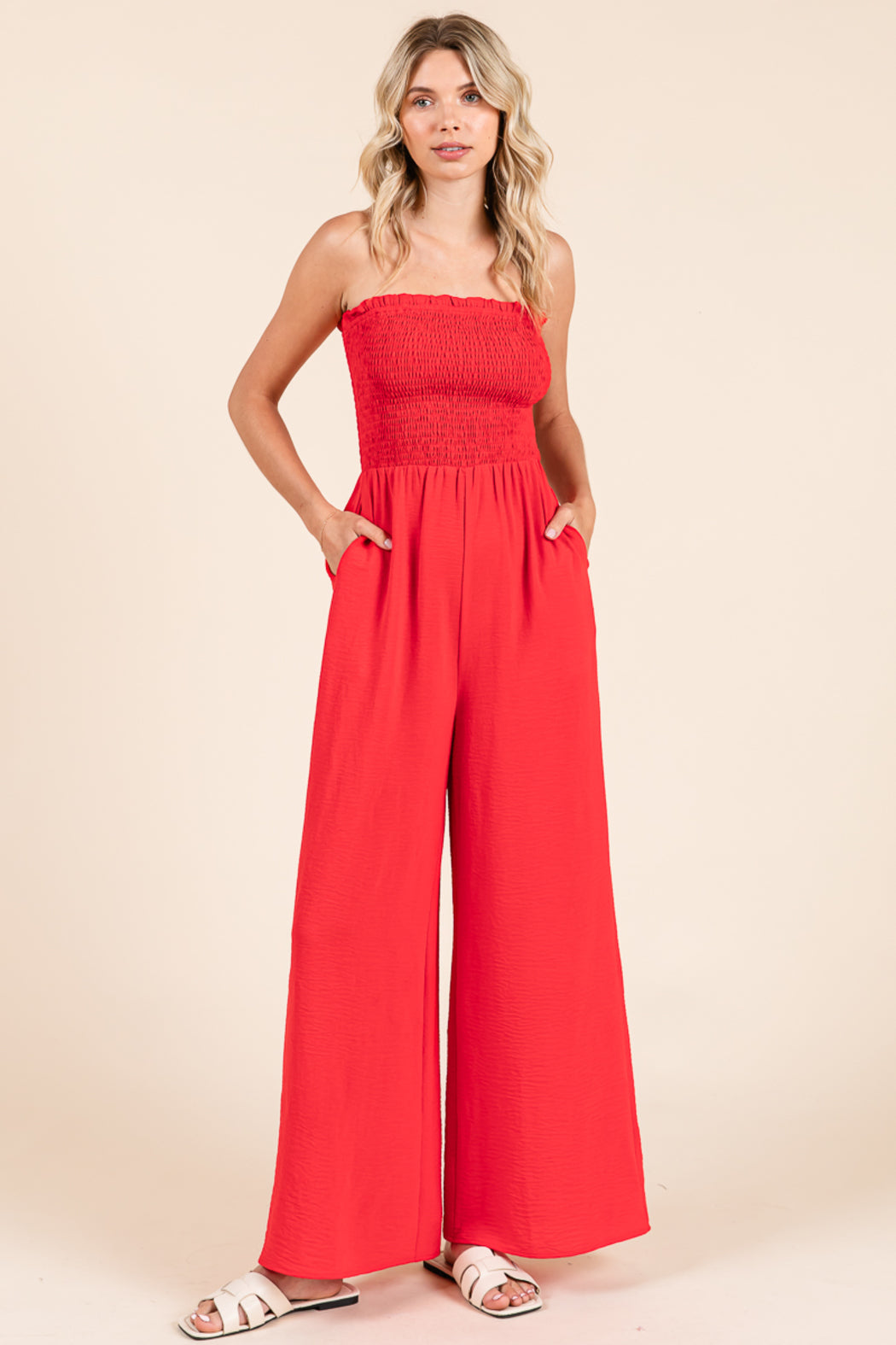 strapless jumpsuit, red jumpsuit, blue jumpsuit, smocked jumpsuit, women's wide leg jumpsuit, summer one-piece outfit, vacation jumpsuit, trendy boutique jumpsuit, resort wear 2025, breathable jumpsuit with pockets