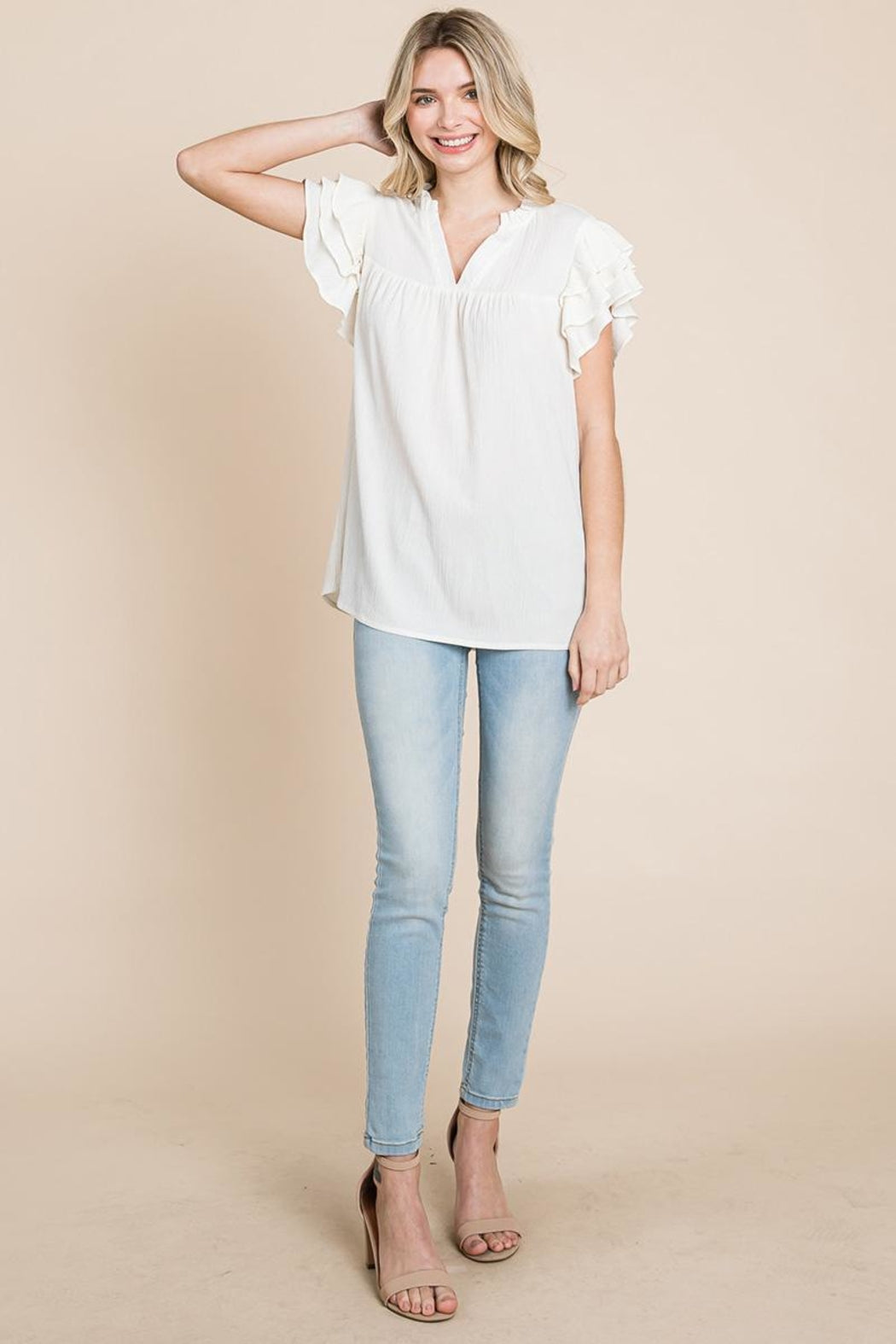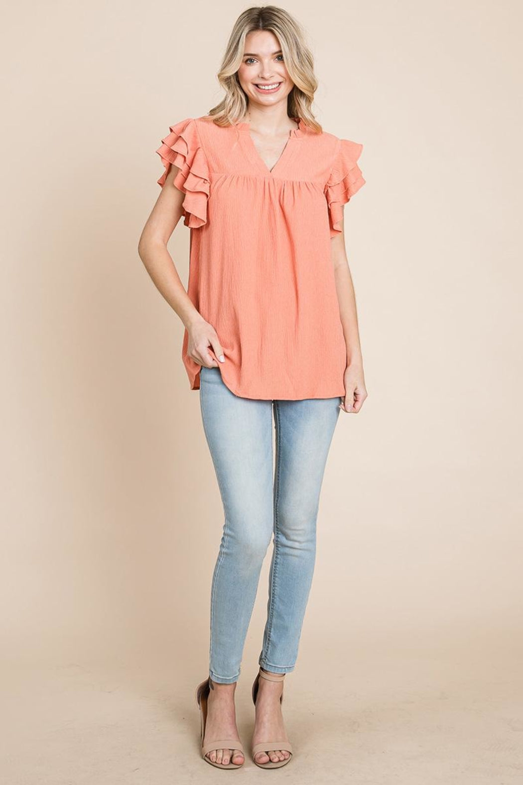 Features: Short Flutter Sleeve, V neck, Ruched, Textured, Solid Color