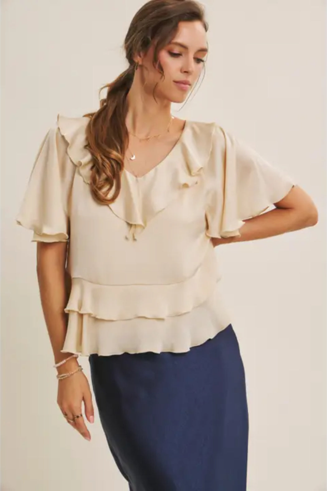 A timeless blouse that blends understated shine with everyday sophistication. Crafted from satin-like crinkled fabric, it offers a subtle, elegant sheen—never overly glossy—adding just the right amount of polish to your look. The V-neckline frames the face beautifully, while short ruffle sleeves bring a touch of femininity. Its loose fit drapes effortlessly, making it ideal for both formal occasions and classic workwear styling. Pair with tailored trousers for an office-ready ensemble, or tuck into a midi skirt for an elevated evening look. A versatile, seasonless piece that transitions seamlessly from day meetings to after-hours plans.