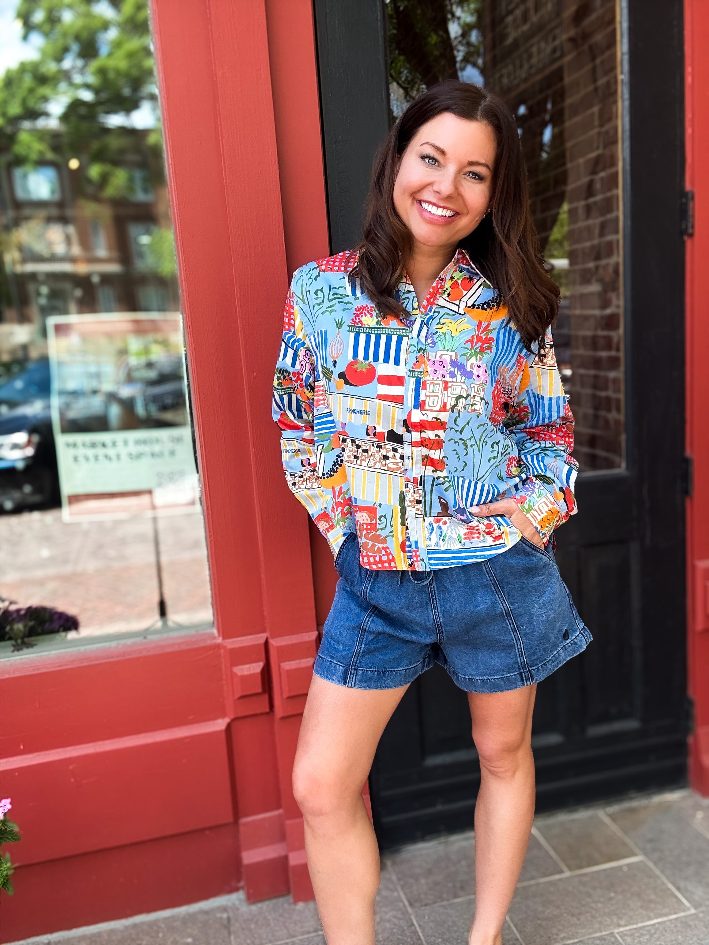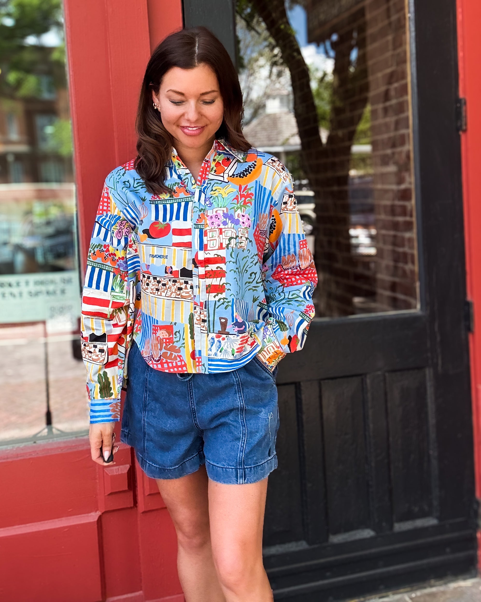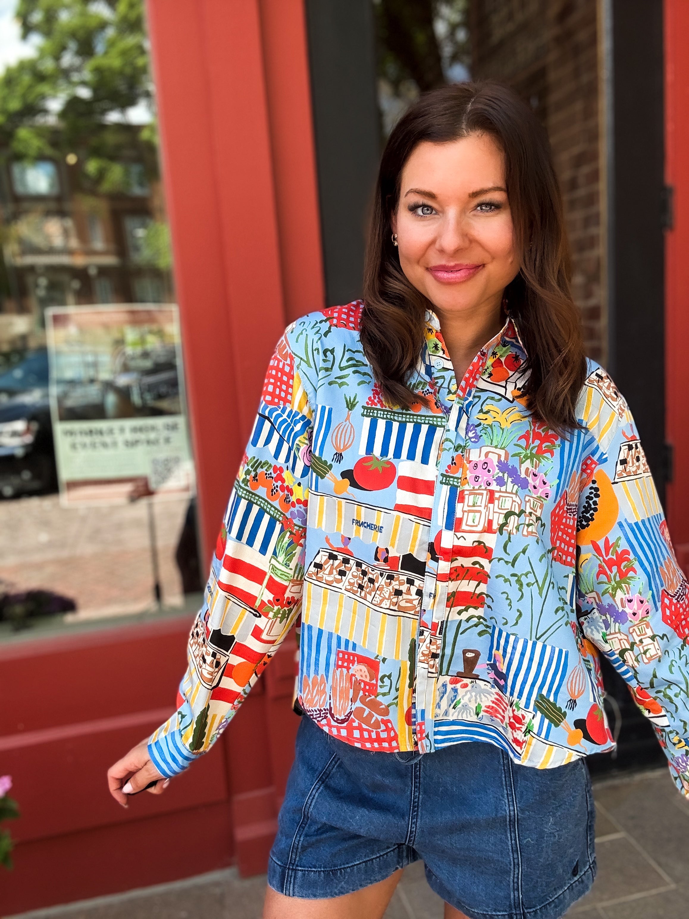 Add some chic to your wardrobe with the Cafe Chic Top. This printed top features a button up front and a cute collar. Plus, the tie detail in the back adds a touch of playful flair. Perfect for any occasion, this top will have you feeling stylish and confident.