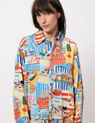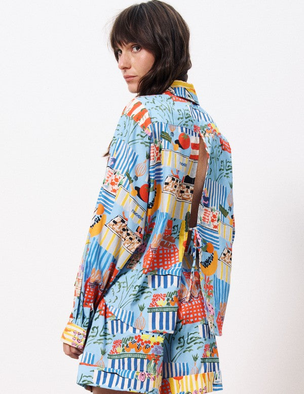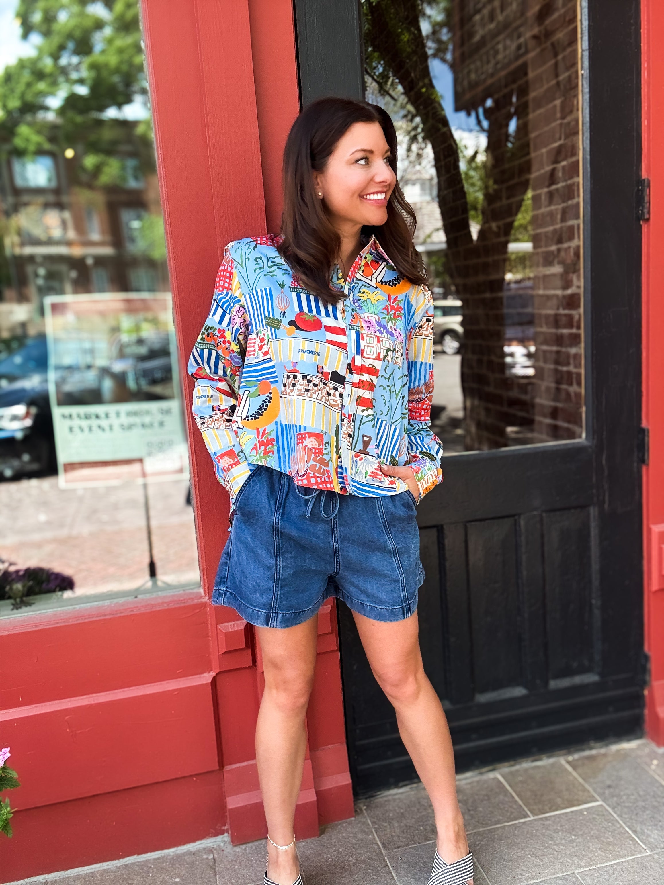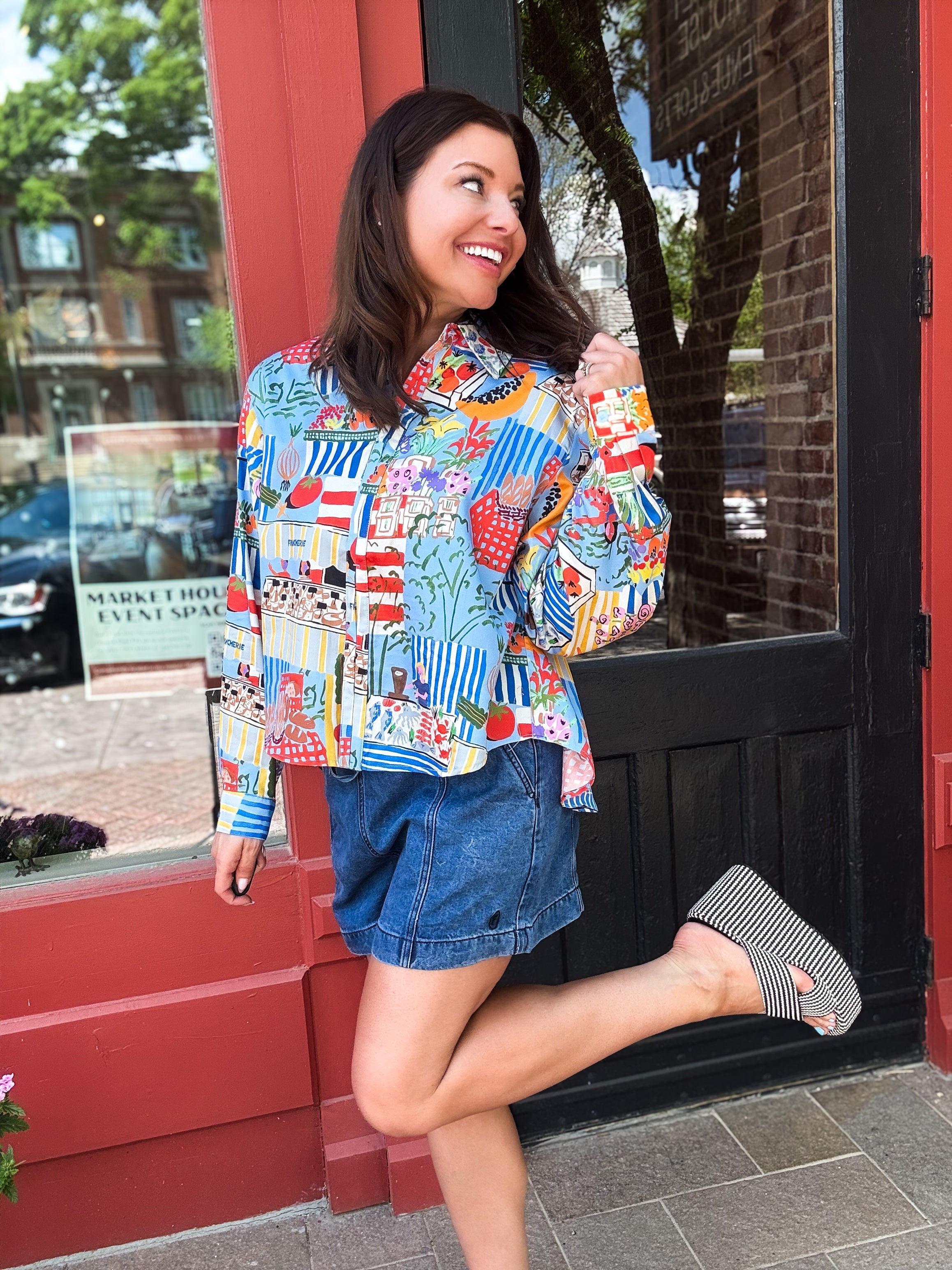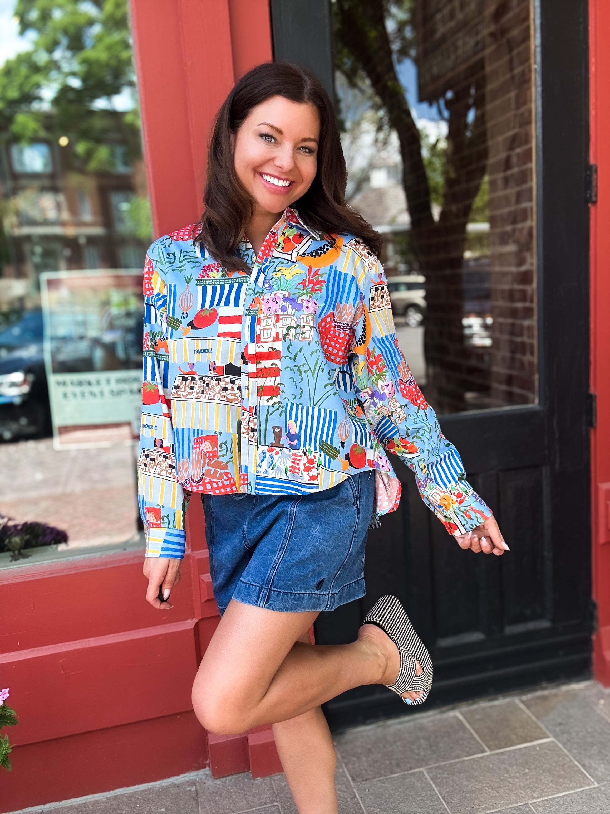 Add some chic to your wardrobe with the Cafe Chic Top. This printed top features a button up front and a cute collar. Plus, the tie detail in the back adds a touch of playful flair. Perfect for any occasion, this top will have you feeling stylish and confident.