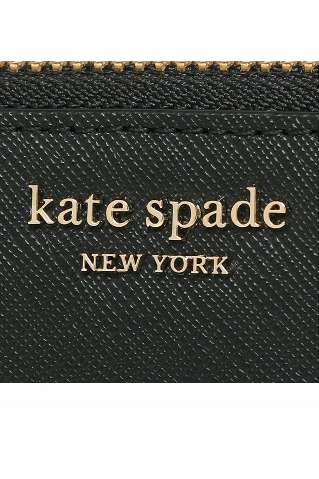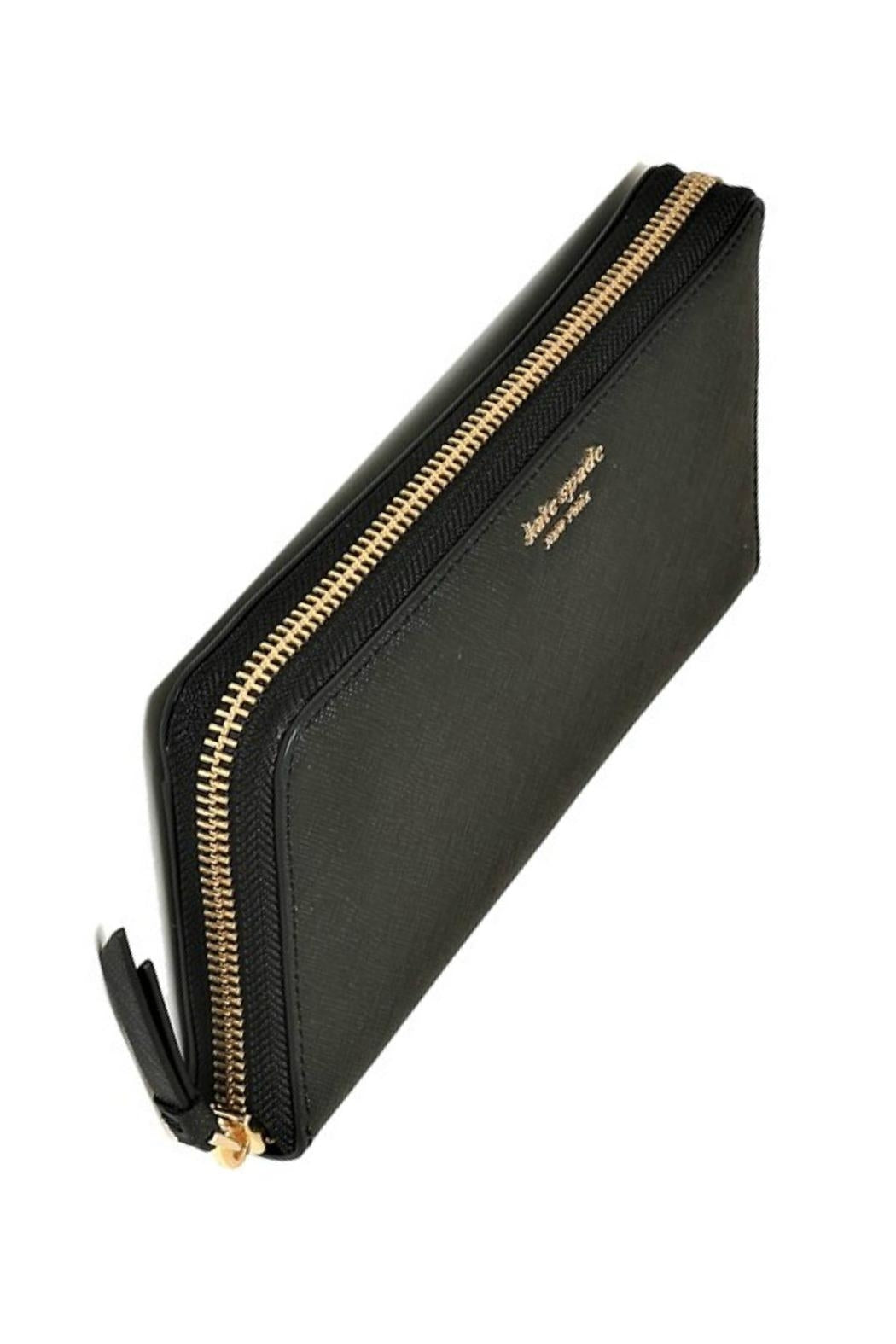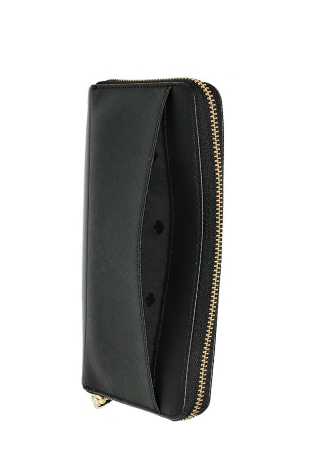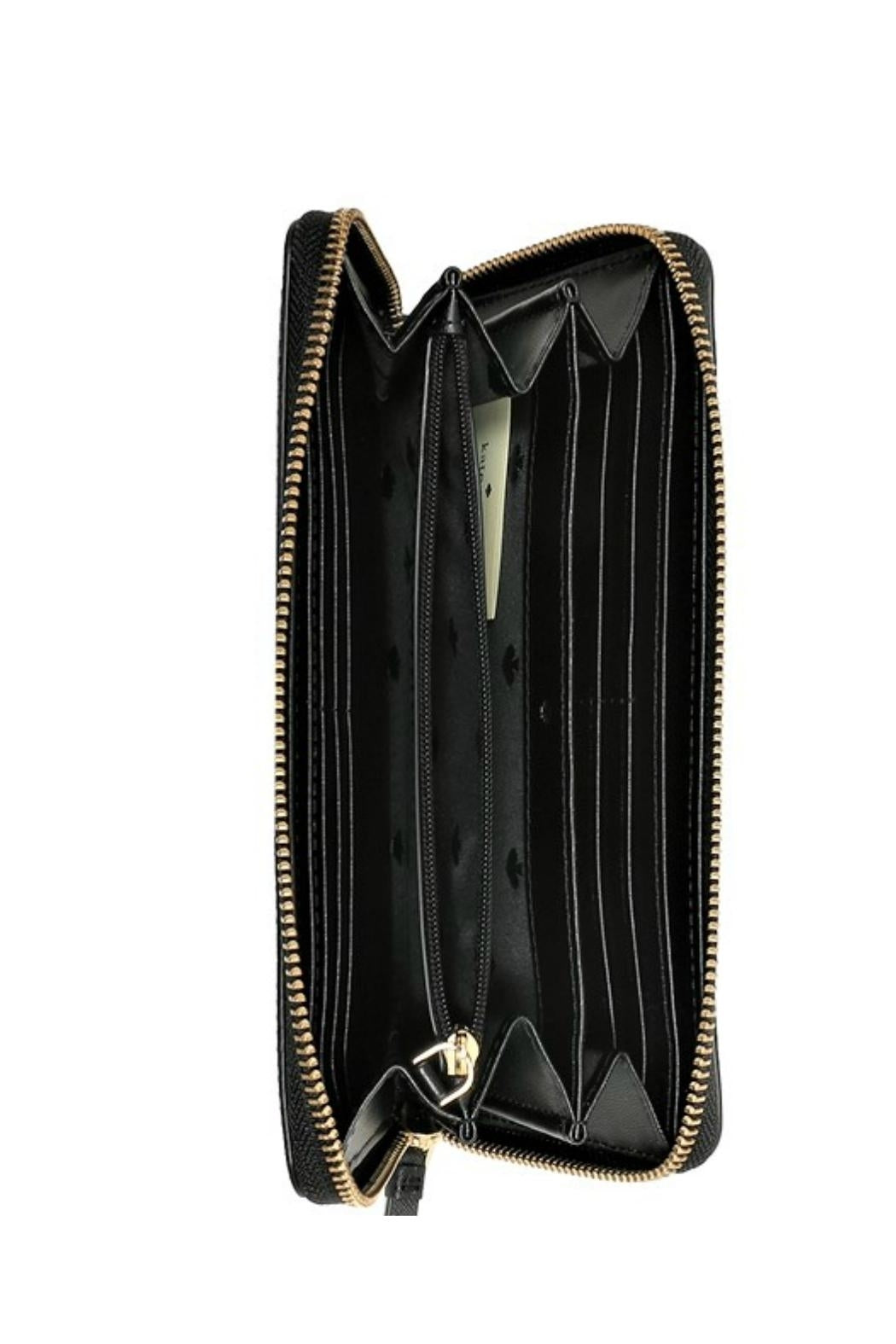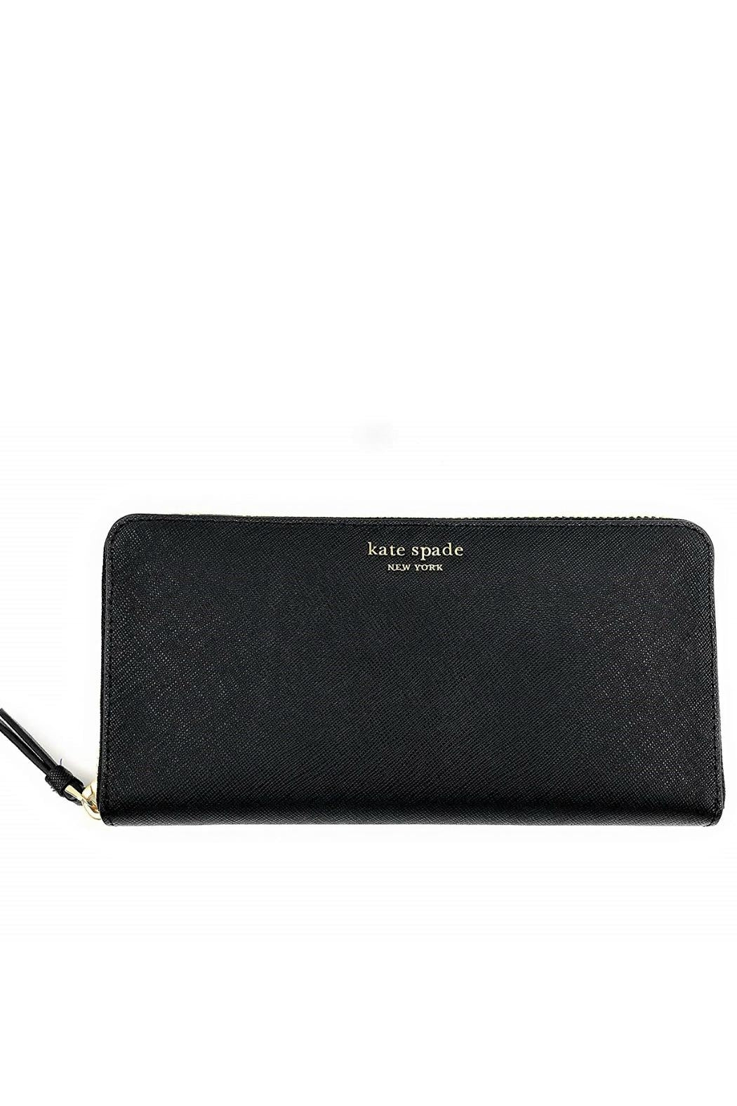 Meet the Kate Spade Leather Large Continental Wallet from the Cameron Collection in the color Black. Classic saffiano 100% cowhide leather with a leather and signature polyester lining. 14k light gold plated signature pin lettering and hardware. Inside are 12 credit card slots, zipper change pocket, 2 bill slots, and 3 pleated pockets (one will store your phone up to 7" long). On the back is a slip pocket that could also be used for a phone. Zip around continental wallet. Click on "Mimi's Gift Gallery" on this page to find other Kate Spade accessories. Dimensions: 8" long x 4" high.