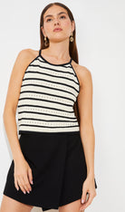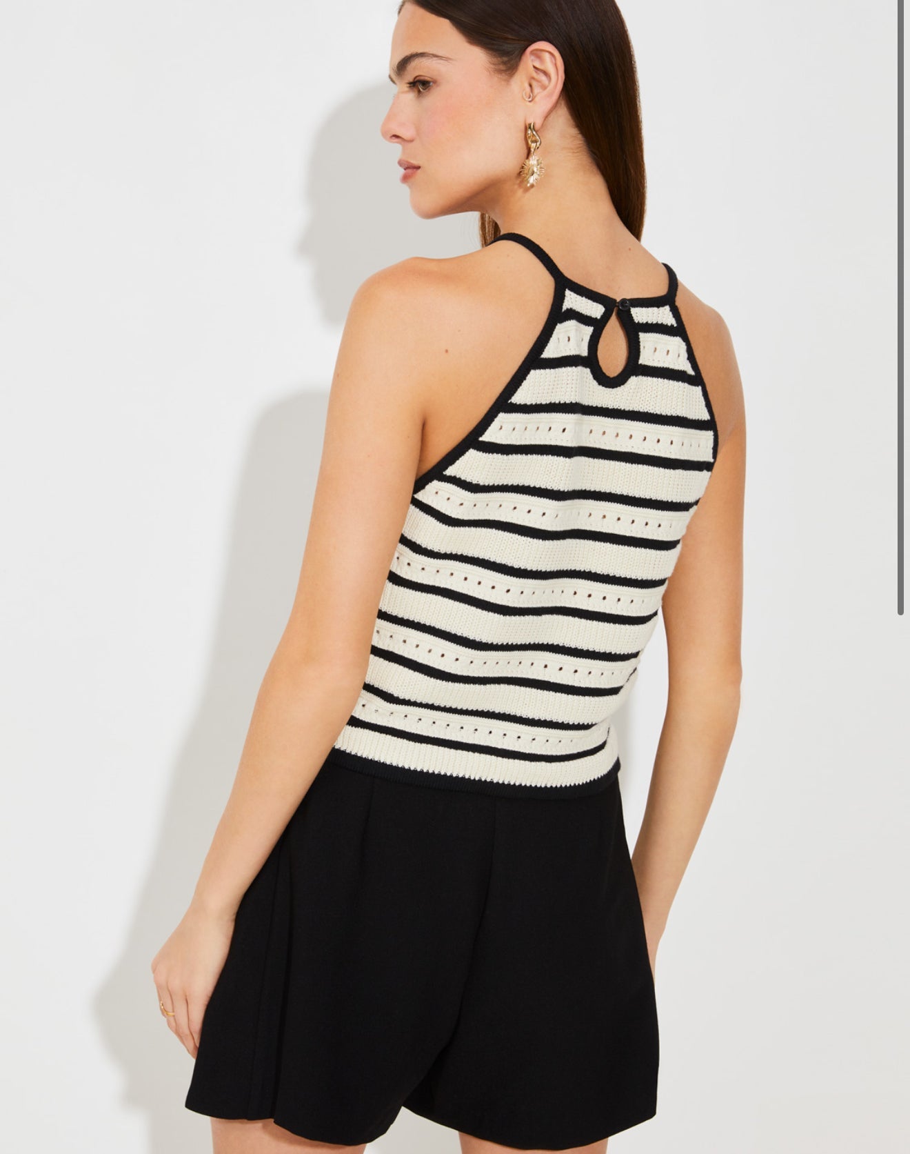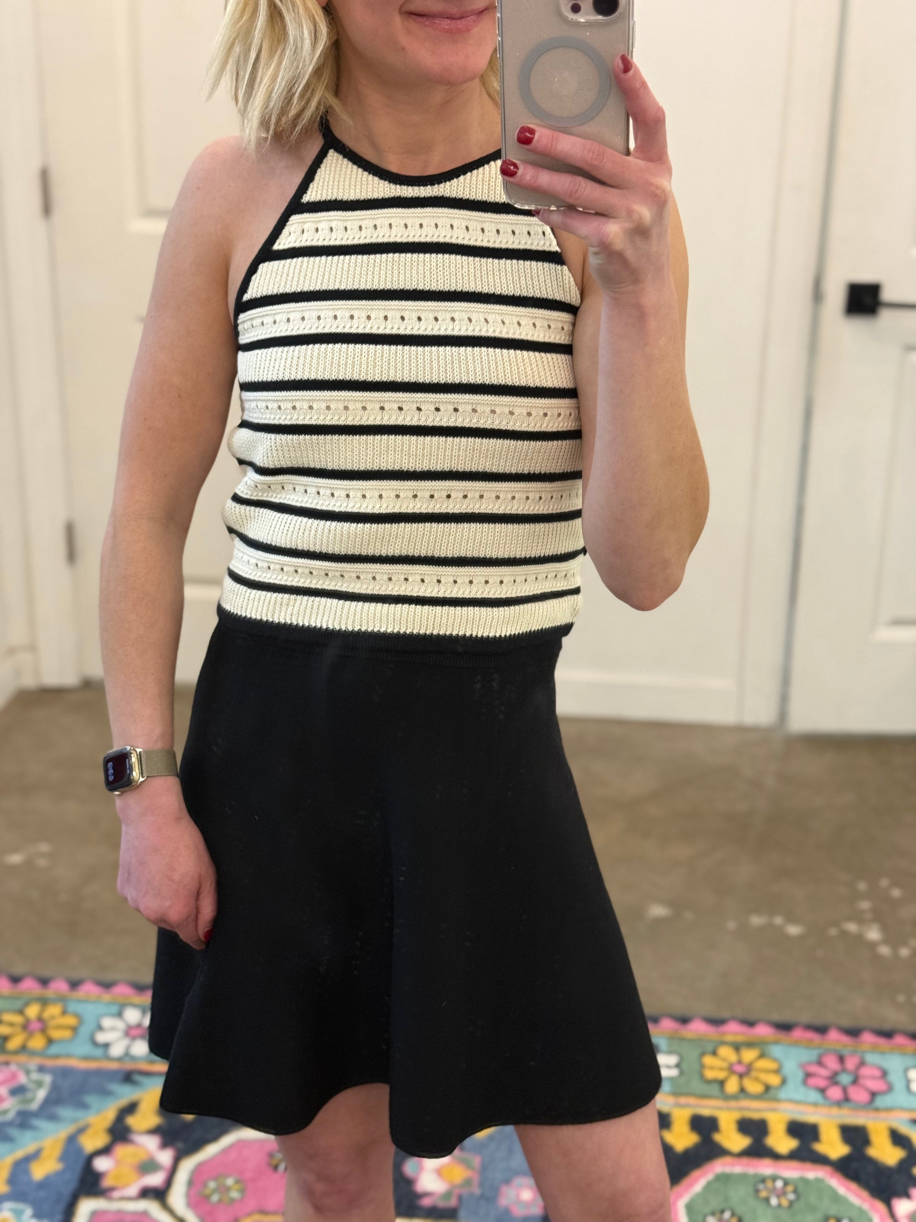 This cute knit jumper features a pretty knit of white and black. Pair with your favorite black shorts or skirt and wedge or slide to complete the look! Runs true to size. Sarah shown in a small.