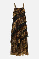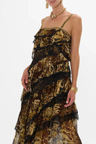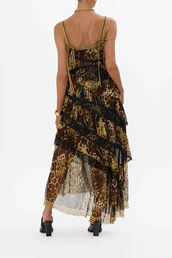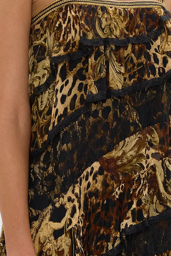 Designed in Australia, The Era Of Empires Asymmetric Spliced Lace Dress blends architectural splendor with echoes of classical antiquity and hieroglyphs against a backdrop of decadent black and luminous gold. Lovingly handcrafted, this CAMILLA asymmetric lace dress features wide shoulder straps and a voluminous fit throughout. Adorned with soft ruffles and fine lace panels and edgings, this striking dress imbues artful opulence.