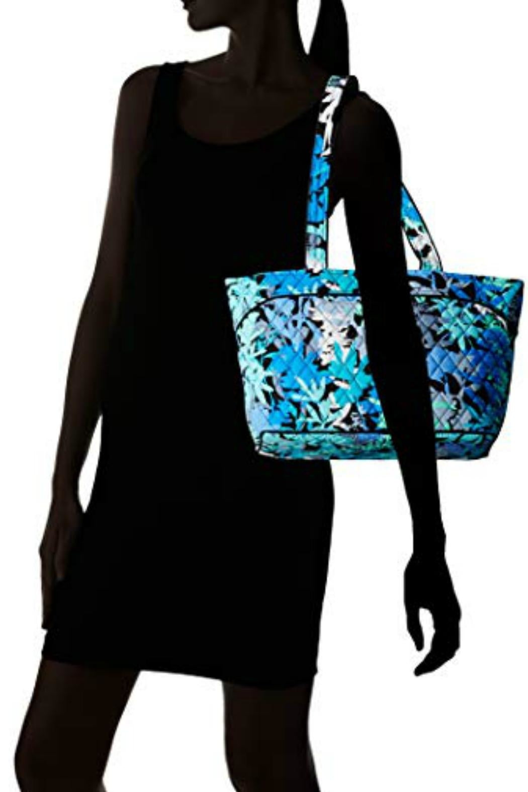 Here is the Vera Bradley Mandy in the Camofloral pattern. A recessed zipper closure opens to reveal a pocket-happy handbag. Six interior compartments and a front slip pocket promise to contain all you wish to carry, while double quilted handles and channel stitching offer a stylish touch. Extremely lightweight cotton quilting outside and smooth poly satin signature lining on the inside. Flat bottom with sturdy insert that is removeable for machine washing (gentle, hang to dry). Click on "Mimi's Gift Gallery" on this page to find other Camofloral bags and accessories. Bottom width 11.5" wide, Top width 16", x 9" tall x 4.75" deep with a double handle drop of 11".