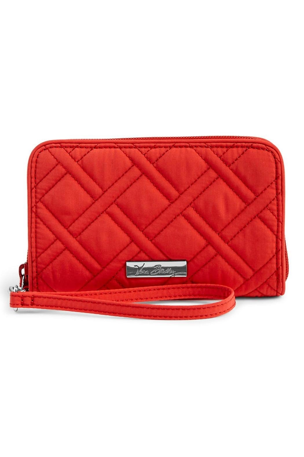 This is the Vera Bradley RFID Grab & Go Wristlet in the color Canyon Sunset (and if you've ever seen a real canyon sunset, YOU know the color we're talking about. RFID protection guards your cards against uninvited scans. It's smaller size makes it perfect to slip inside today's small crossbody bags and clutches. The signature basket weave quilted microfiber is bright and lightweight. Features four credit card slips, two gusseted compartments, and two bill pockets, a zip coin compartment and zip closure with silver tone hardware. Find other accessories in the Canyon Sunset color on the "Mimi's Gift Gallery boutique page. Dimensions are 7" wide x 4 1/2" high x 1" deep with a 6" removable wrist strap.