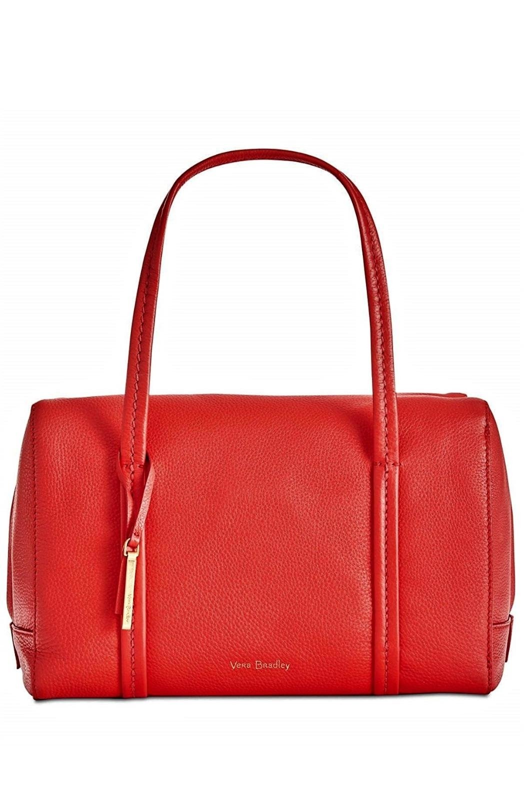 This is the Vera Bradley Leather Mallory Satchel in the color Canyon Sunset. You know what you like in a bag: a great silhouette, just the right amount of organization and style to spare. And there's just nothing that quite compares to the look, the scent, and the feel of great quality vegetable tanned cowhide leather, and it only gains character as it is used! Double carry handles plus a removeable adjustable shoulder/crossbody strap add to it's versatility. On the front is gold engraved leather signature detail, and a hidden side zip pocket. Inside is 2 slip pockets and 1 zip pocket. Beside the top zip is the perfect phone zip pocket. The lining is sewn from sturdy 100% cotton in a beautiful vintage print. Gold tone hardware. Zip top and sides closure. Flat bottom so it stands up nicely when at rest, but it will also fold for storage and travel. Click on "Mimi's Gift Gallery" to find other Vera Bradley leather bags and accessories and more in the Canyon Sunset color. Dimensions: Measures approximately 12-1/4" Wide x 7-3/4" High x 5" Deep with a 5" double handle drop and 20" max shoulder strap drop.