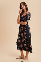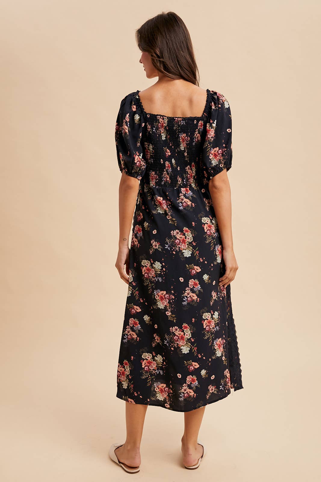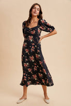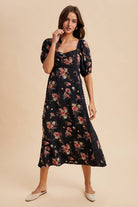 Embrace timeless elegance with this Floral Sweetheart Lace Dress. Its vintage-inspired floral print and sweetheart neckline with delicate ruching create a romantic look, while puff sleeves with elasticized edges add charming volume. Decorative lace trims enhance the bodice and side panels, and the smocked back ensures a comfortable, flexible fit. The flowing midi-length A-line skirt features a side slit for graceful movement. Fully lined for comfort, this dress effortlessly combines classic style and flattering comfort for any occasion.
