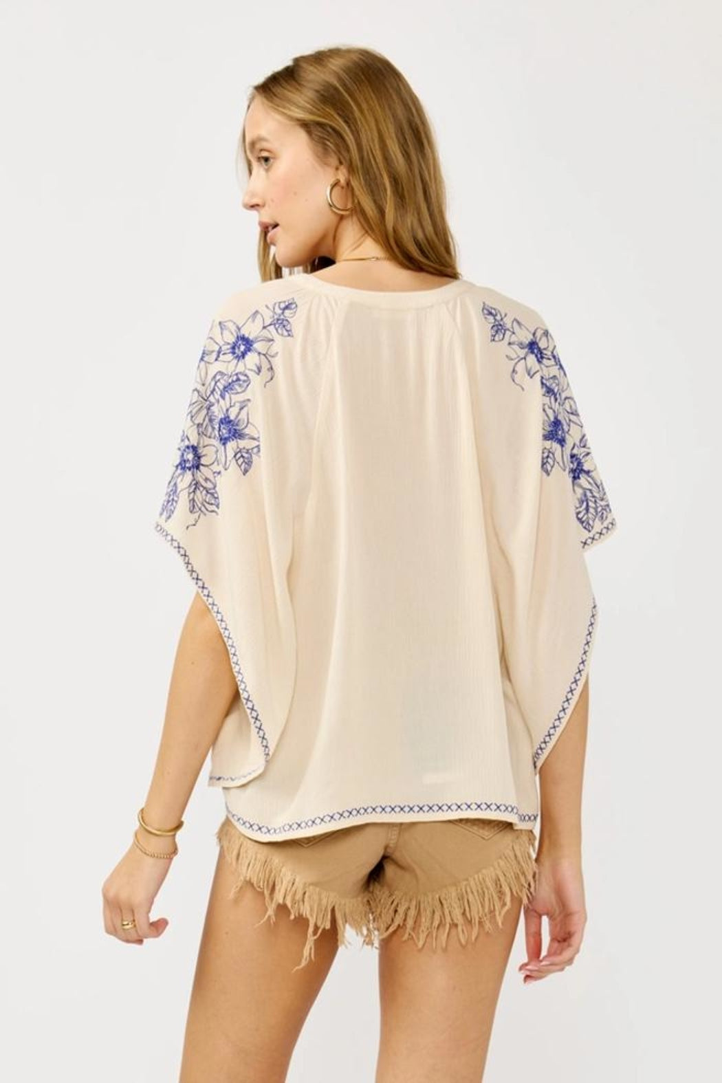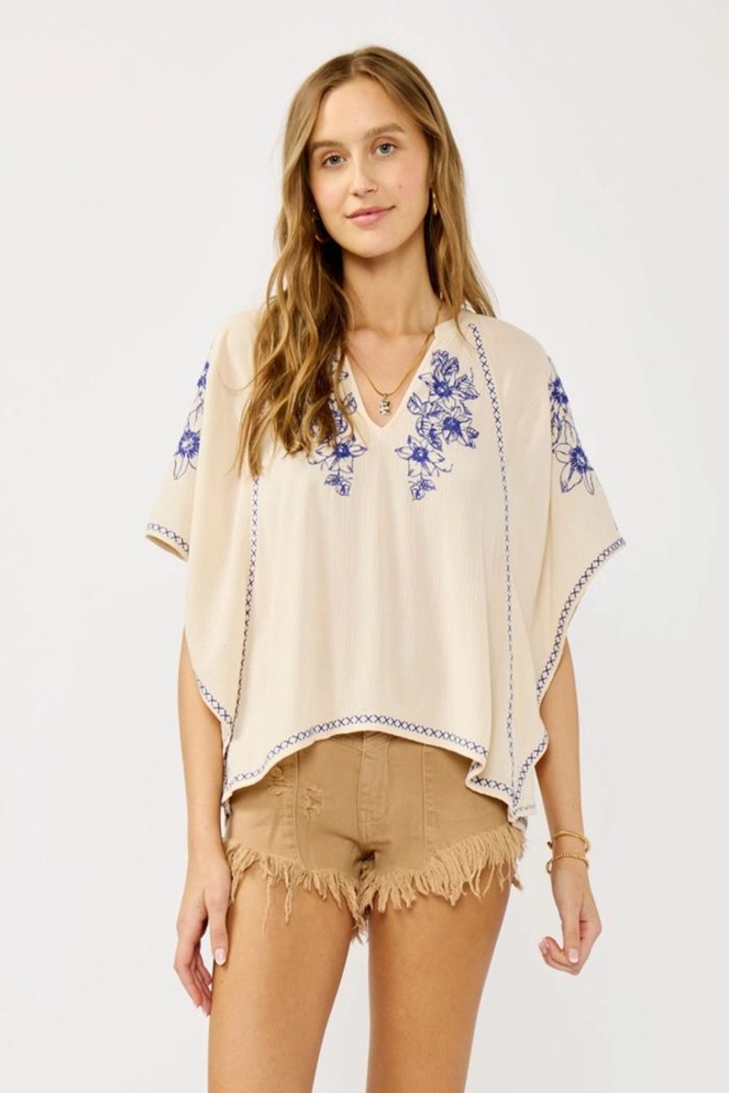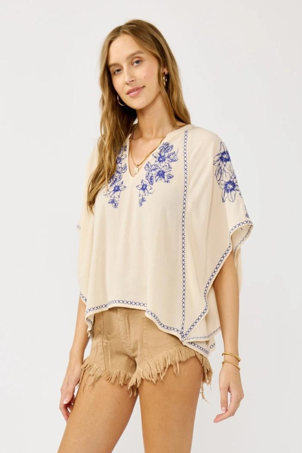 Effortlessly boho and breezy, this embroidered V-neck top is a must-have for warm-weather styling. Crafted from airy crinkle gauze, it features delicate blue floral embroidery across the front and sleeves, with artisanal “X” stitch detailing along the edges. The relaxed silhouette, open side slits, and curved V neckline give it an easy, flattering fit.
