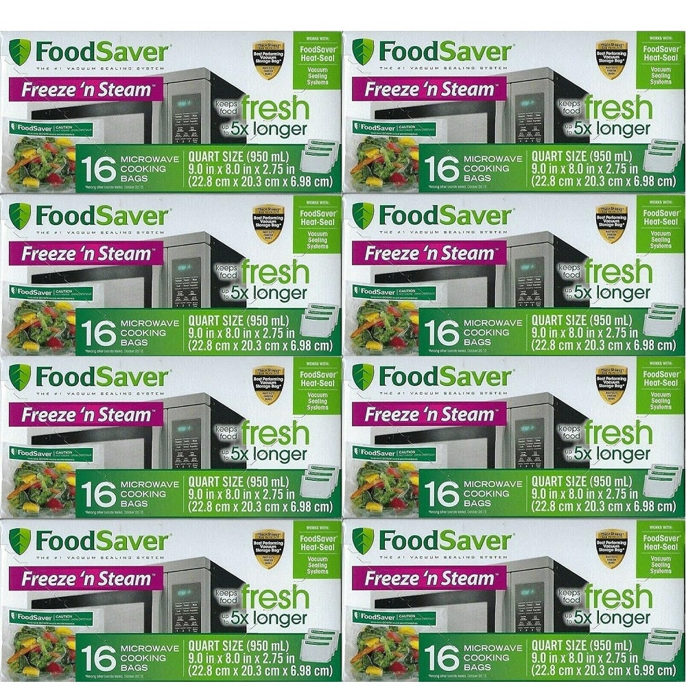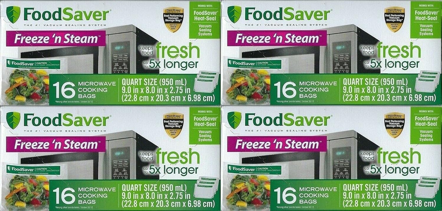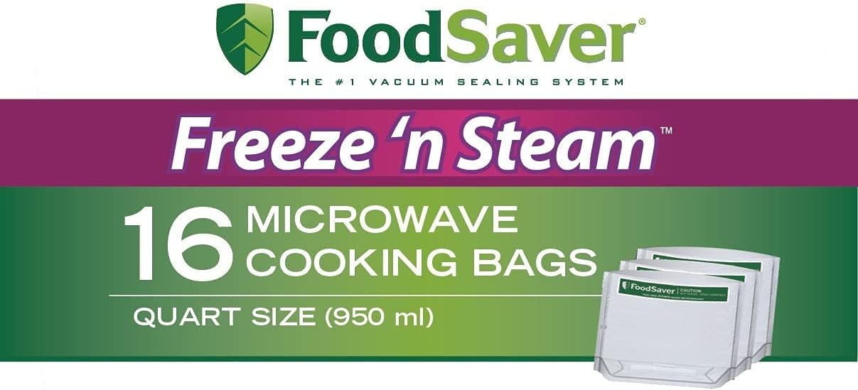 FoodSaver Freeze 'N Steam Vacuum-Seal Bags are specially designed for easy filling. Get a head start on dinner by preparing your Freeze 'N Steam bags in advance simply fill the bag, season your food, vacuum seal, store in the freezer or refrigerator, and microwave when needed. FoodSaver Bags preserve, protect, and prevent freezer burn. Multi-ply construction blocks moisture and oxygen and makes the bags strong enough to microwave. Eat fresh and healthy from the freezer to the table using FoodSaver Freeze N Steam bags. These microwaveable bags are designed with strong multi-ply construction to block moisture and oxygen and prevent freezer burn. Always have a healthy meal on hand by prepping food freezing it in bags and then microwaving it whenever you are ready for a hot meal to enjoy fresh seasonal foods any time of year by portion sealing in peak season and freezing for future use. Ideal for busy households to forego the high-fat high-calorie fast foods and serve quick home-cooked meals in a snap with no pots or pans to clean either. Use FoodSaver heat-seal vacuum sealing systems to keep food fresh up to 5X longer contains 16 Freeze N Steam quart-size microwave cooking bags