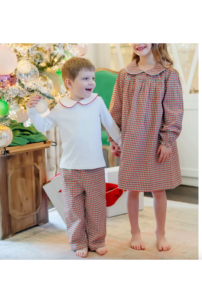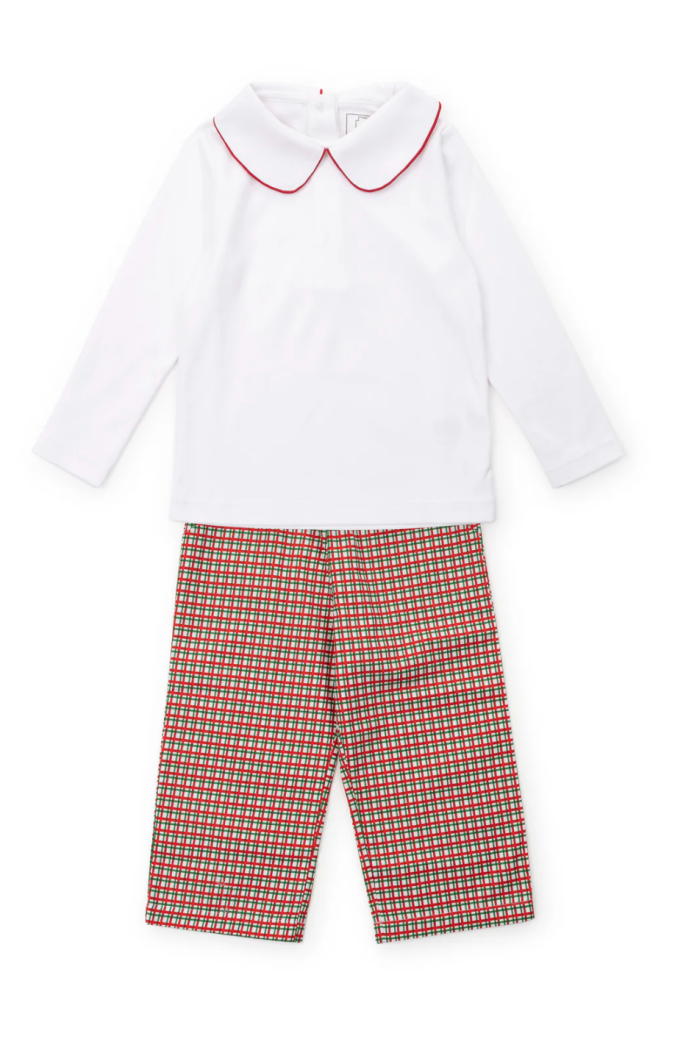 BOYS' LONGSLEEVE PETER PAN COLLAR SHIRT WITH PIPING ACCENT. PAIRED WITH PRINTED WOVEN PIMA COTTON PANTS.