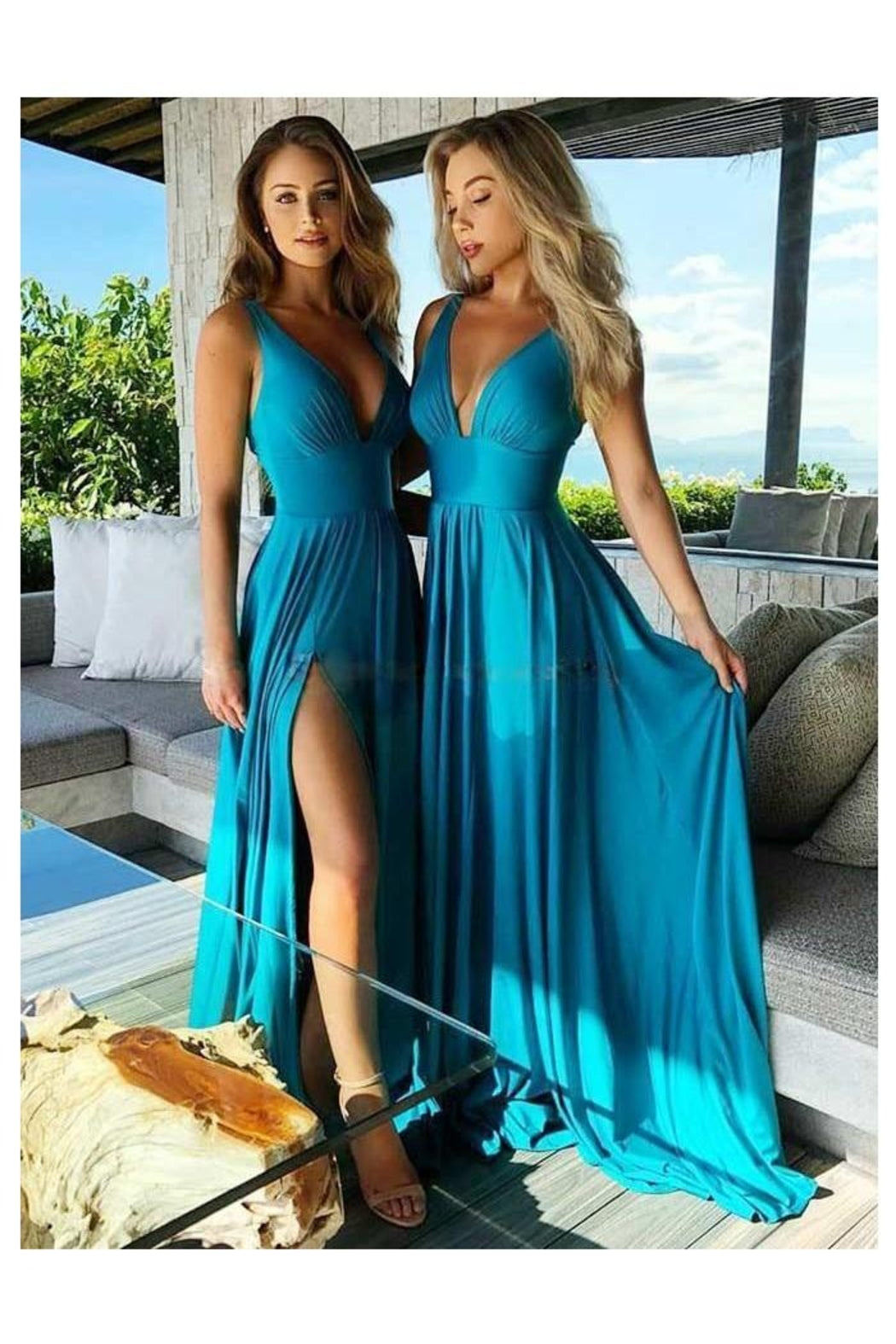 Beautiful plunging deep v-neck formal maxi dress with a leg flaunting side slit. Pleated A-Line. Elegant and Sexy.