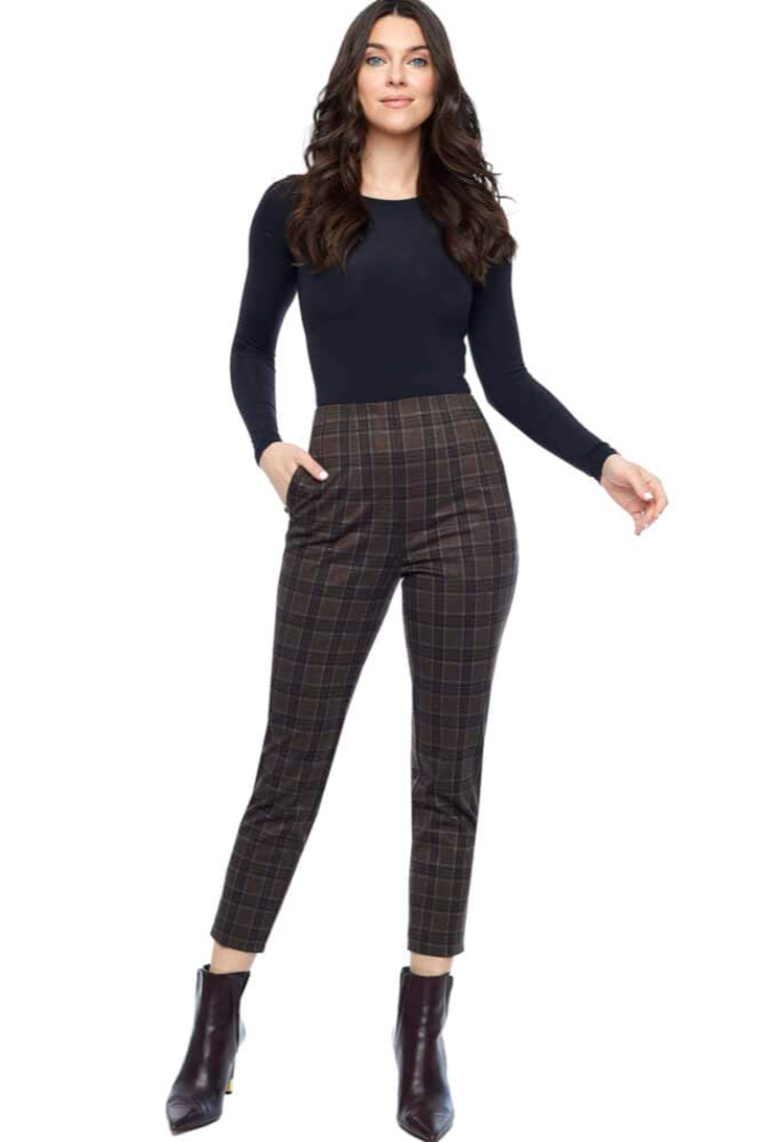 Plaid has long been the hero pattern of fall fashion, and one of the most enduring sartorial trends of all time. Blend the ubiquitous print with another current style obsession, the relaxed trouser, and you have the coveted Gigi Carlow. Cut with a slouchier silhouette and made with a sumptuous Ponte di Roma fabric, the fit is comfortable, current, and uber-cool. Front pleats and a faux fly inject a dose of tailored sophistication, for a style that will elevate any outfit this season. Pair a sleeveless turtleneck and structured blazer for a fashionable day at the office, or try it with sneakers, a vintage tee and moto jacket for an edgy downtown vibe.