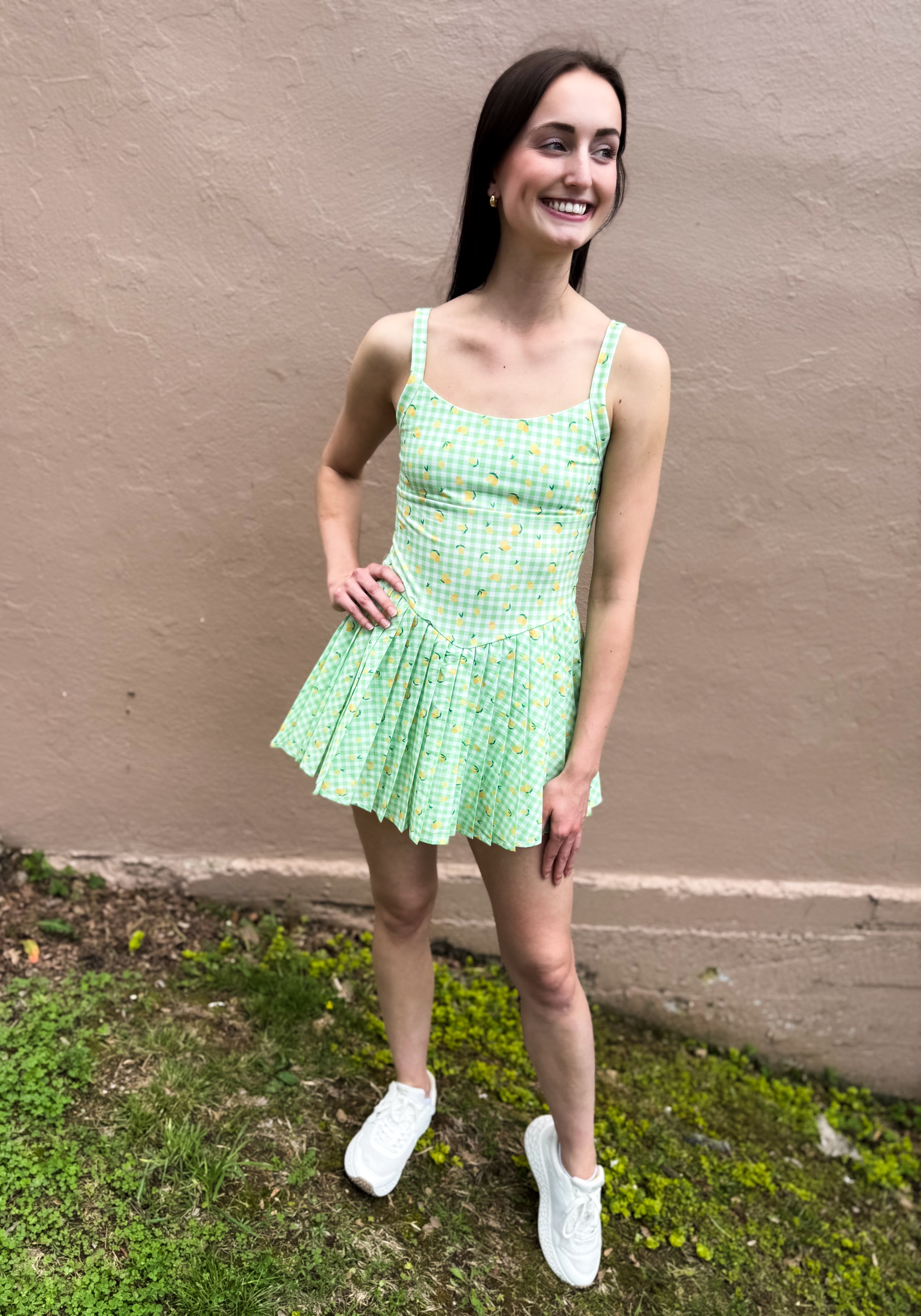 Get ready to add some zest to your wardrobe with our Gingham Lemon Sporty Romper! Featuring a playful lemon print, adjustable spaghetti straps for the perfect fit, and a pleated skirt with shorts underneath for ultimate comfort. Stand out in style and have a slice of fun!