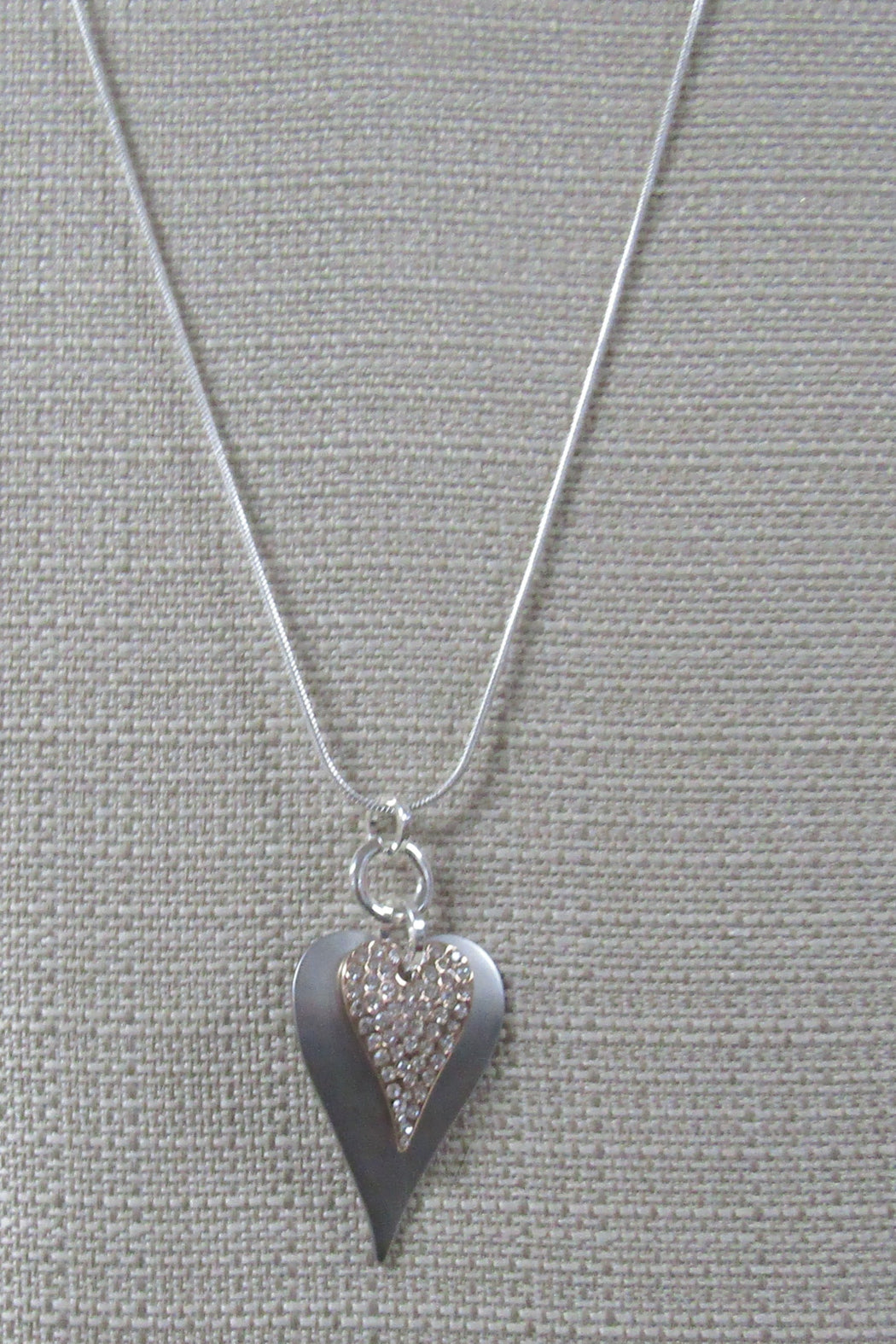 Charming long silver pendant necklace. Double heart drop is brushed silver topped with a rose gold rhinestone heart. Eco friendly alloy; lead and nickel free.