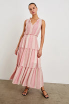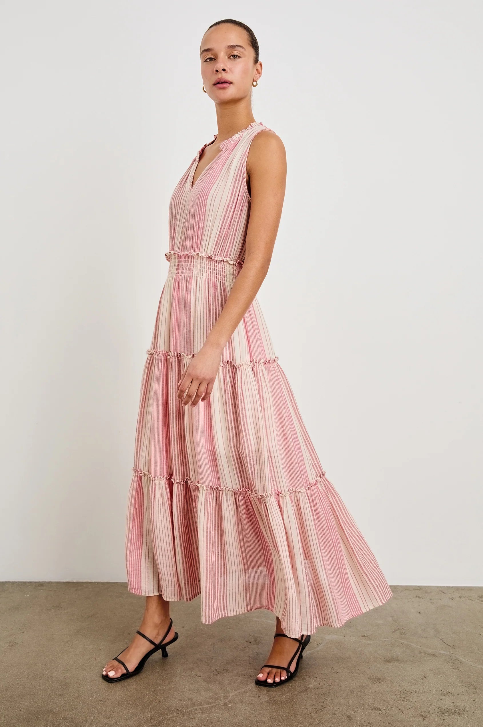 The Lou Lou is a luxe linen-blend dress with waist-cinching smocking. This maxi has a v-neckline and fully-lined skirt with ruffle detail at each tier.