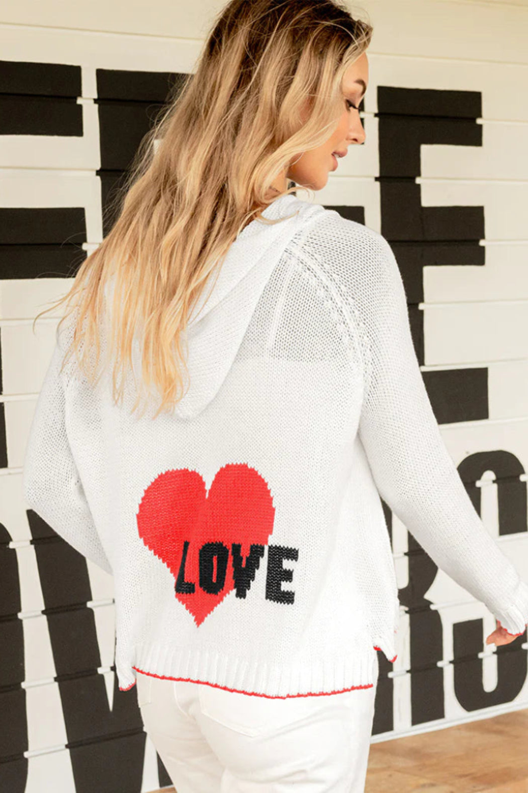 Stay cozy and stylish with this lightweight hooded sweater, crafted from a soft cotton blend for ultimate comfort. Featuring a zip-up front and subtle Red trim accents, it’s perfect for layering on casual days. The back showcases a bold knit heart graphic with the word "LOVE," adding a playful and eye-catching touch. Designed with a relaxed fit, ribbed cuffs and hem, and mini side slits, this sweater combines versatility and charm, making it a go-to piece for any wardrobe. Composition: 60% cotton, 40% acrylic