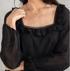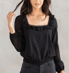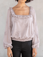 Sheer chiffon long sleeve cropped blouse featuring floral embroidered detail throughout, a square neckline with lattice trim and ruffled detail, a smocked hem, and sheer sleeves with an elastic cuff. Lining attached.