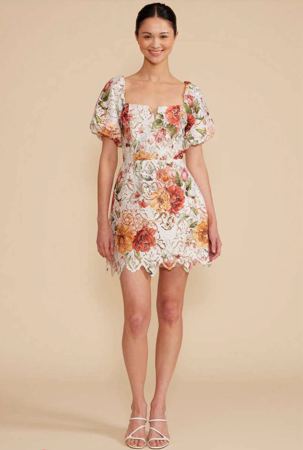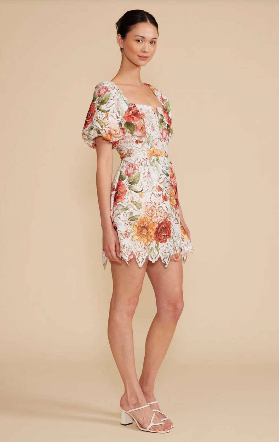 This charming mini dress features a romantic floral print atop intricate white lace for a fresh, feminine look. Itβs designed with a notched square neckline, puff short sleeves, and a fitted waist that flows into a playful, scalloped hemline. The back offers a flattering smocked detail with a delicate tie at the neckline for added charm and a comfortable fit. Perfect for garden parties, brunch dates, or summer getaways, this dress pairs beautifully with both casual flats and dressy heels.