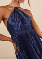 With an elegant look like the Lulus Elaborate Navy Satin Pleated Backless Maxi Dress, you'll be the most memorable person in any room! Sleek, pleated woven satin shapes this gorgeous gown that has a sleeveless, princess-seamed bodice and slender adjustable straps that create a modified halter neckline and crisscross atop the alluring open back. The high, fitted waist sits atop a luxe A-line maxi skirt that'll make you want to twirl all night long. Hidden back zipper/clasp.