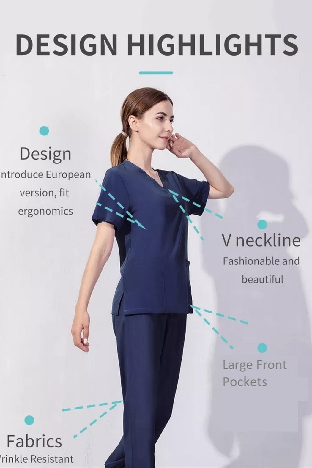 Blue Scrubs - Shirt & Pants Set Navy Blue Scrubs Comfort Fit Pockets Medical Scrubs - Shirt and Pants Set Designed for healthcare workers, Salon Workers and similar.. Use the size chart for a better fit. Made for comfort with a neat look. The fabric has a little bit of stretch in it to adjust to your body. 95% polyester, 3% Spandex, 2% rayon. Soft and breathable fabric, anti-pilling, friction resistant, moisture wicking, chlorine bleach resistant. Pants have elastic waist to adjust to your body. Shirt has two large front pockets, 6" wide x 7" deep. V-Neck. Short Sleeves. Straight leg pants. No cuff. Popular with doctors, nurses, healthcare staff, pet care staff, research facilities, pharmacy staff, medical school, beauty salons and more ... Color: Navy Blue. Please note. We are showing multiple colors in our pictures to give you a better understanding of the scrubs from multiple angles. The color for sale in this listing is Navy Blue. Thank You.