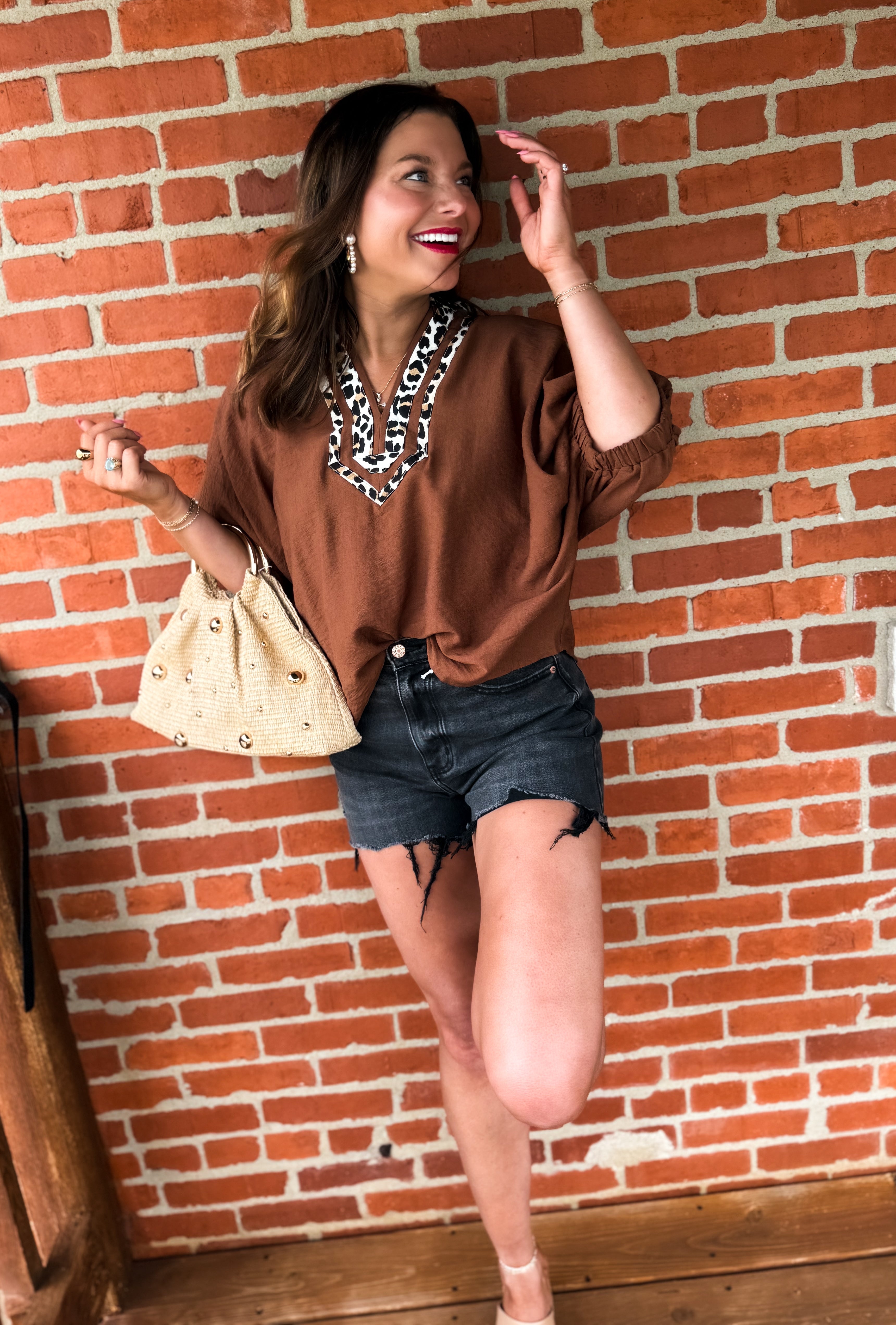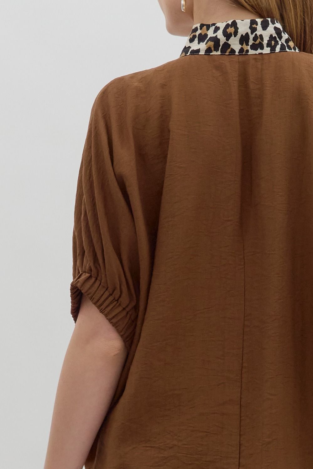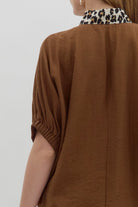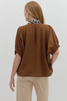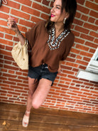 Embrace effortless style with the Mocha Muse Blouse, featuring a playful camel base and bold leopard print trim. Its solid elasticated sleeve bands and dolman silhouette offer comfort and ease, while the caftan-inspired split neck adds a chic touch. Lightweight and woven, this non-sheer top is perfect for layering or wearing on its own for a fun, fashionable look.