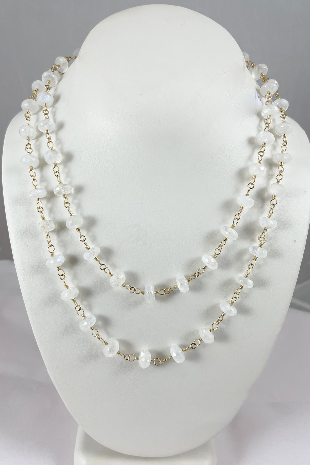 Double length Moonstone necklace can be worn as a long single or double-up for a layered look. Each roundel is individually wire-wrapped with gold-fill.