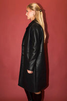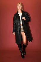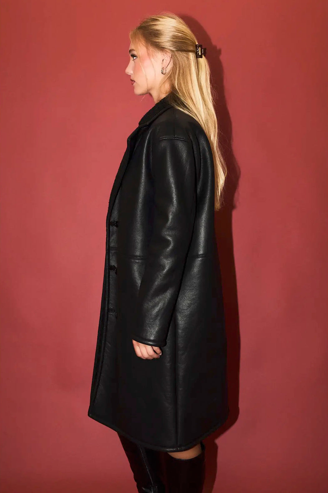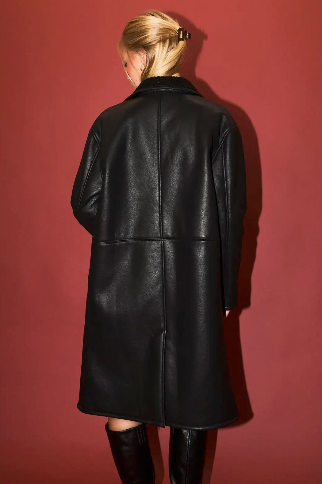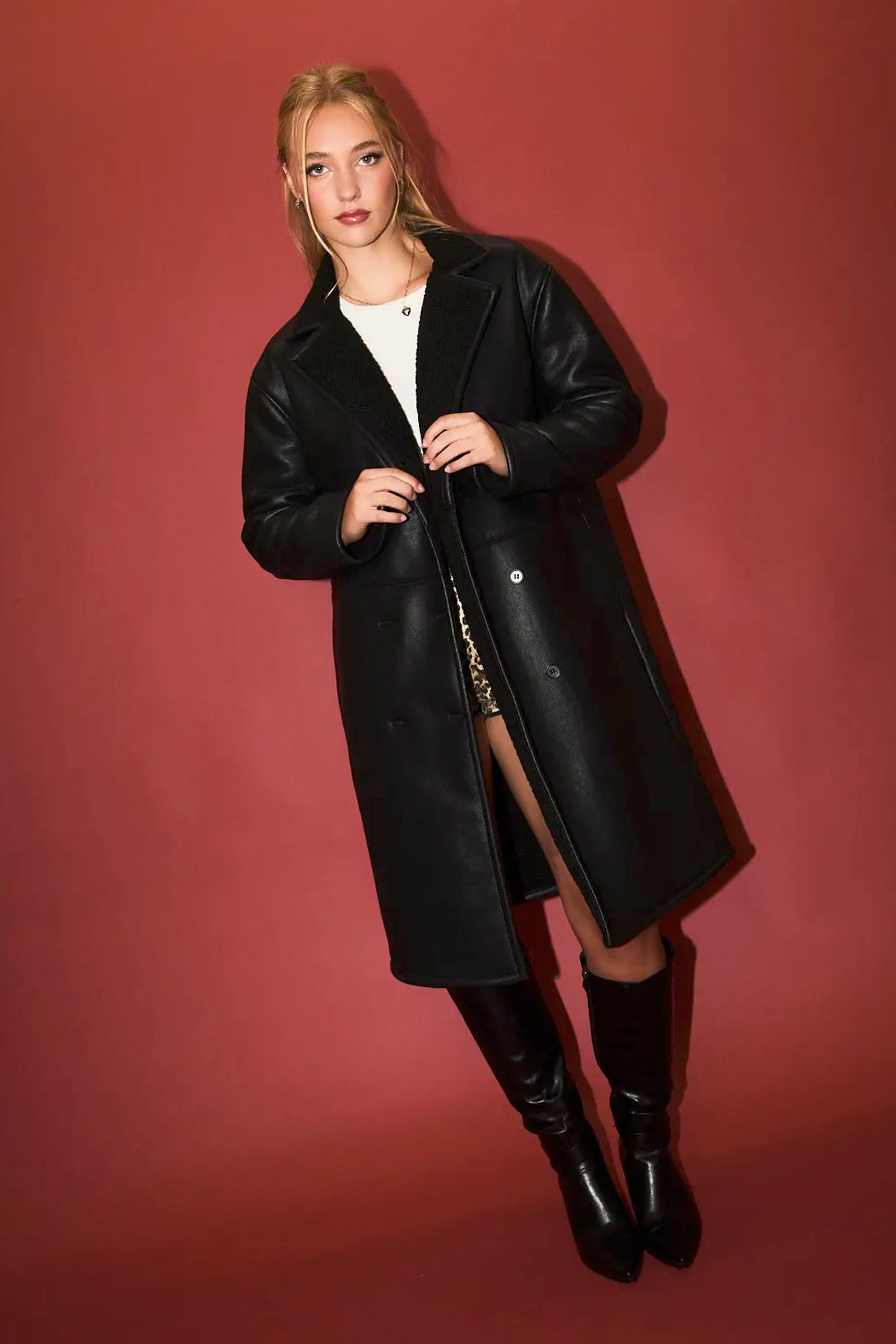 The ultimate cool girl coat, this faux leather trench is shearling lined in black and features black buttons for a monochrome look. Seaming details add visual interest while front pockets make for a practical wear. This coat is ready for any weather and any event. Follow @lunaboutiquecanton on instagram and DM us with any questions :)
