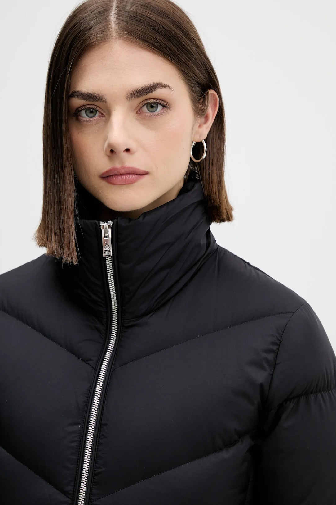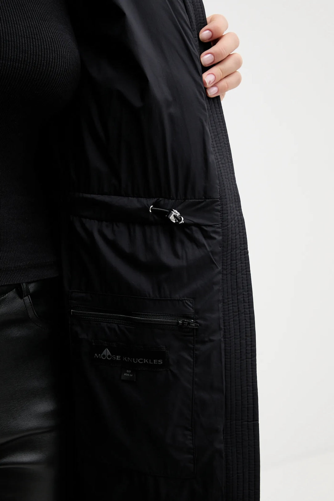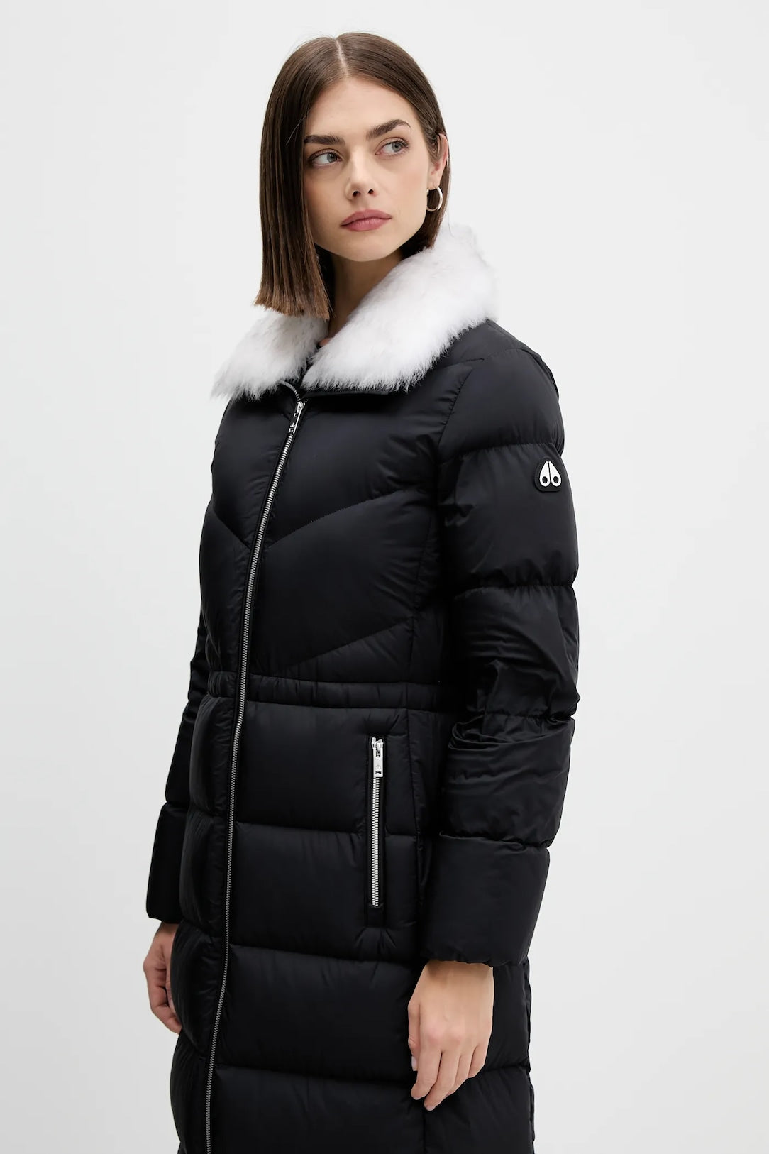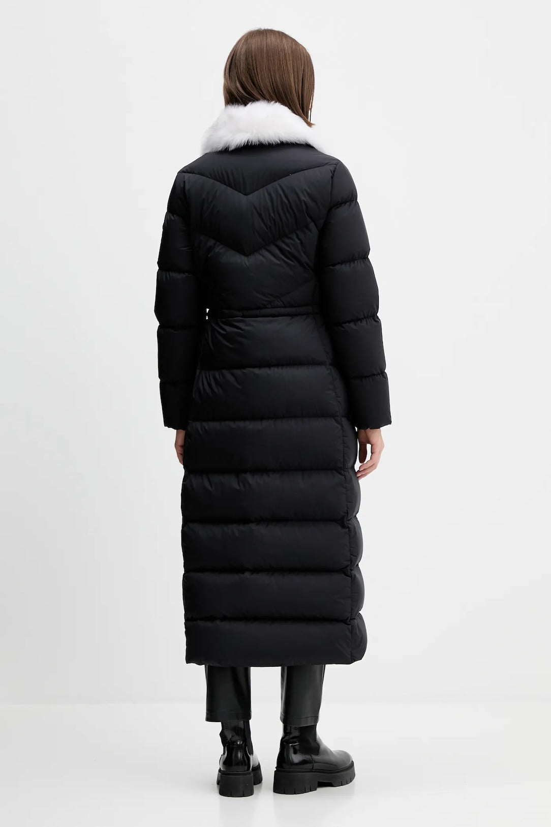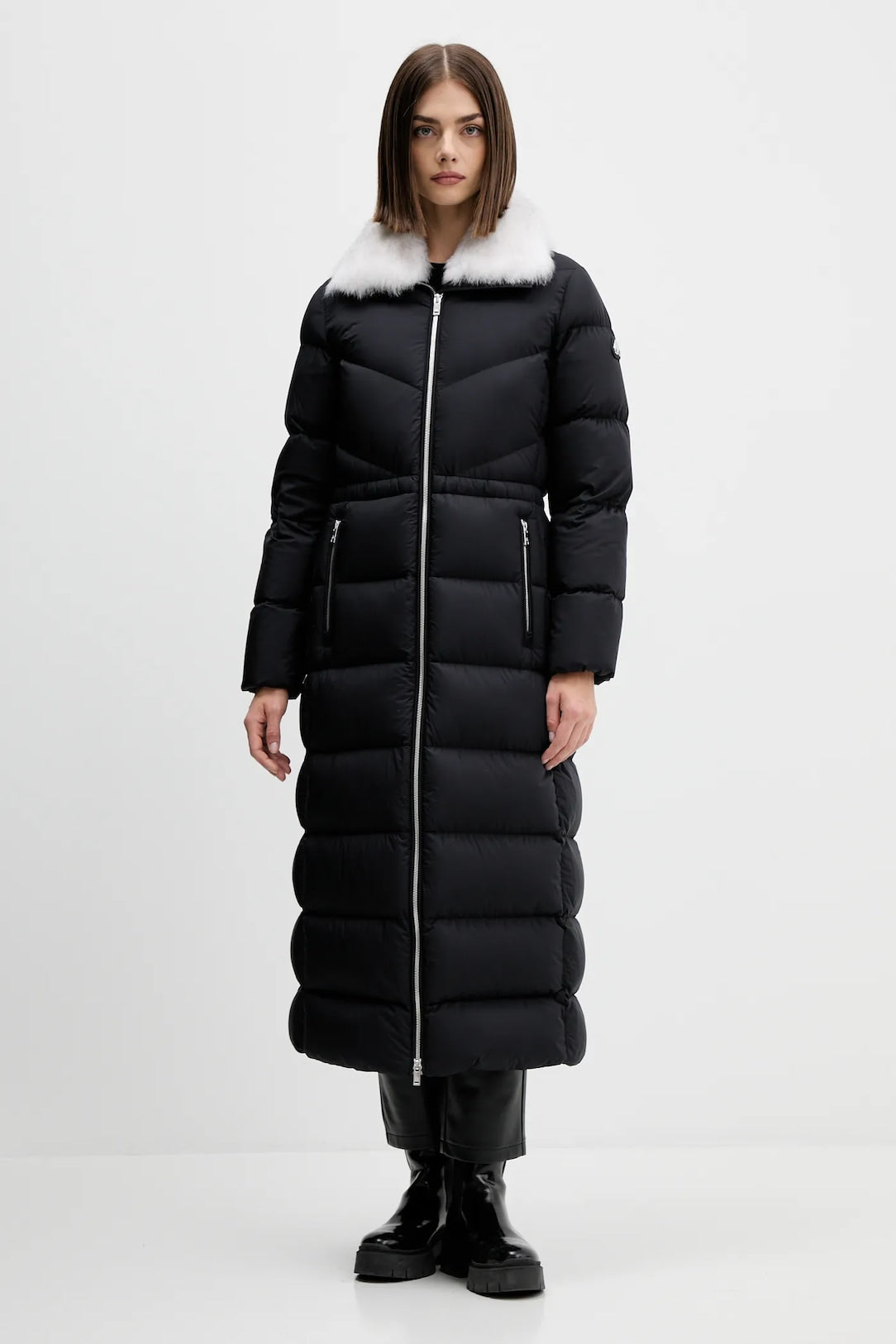 This MOOSE KNUCKLES Belle Cote SH down jacket is your cozy companion for chilly days, crafted from sleek fabric with a snug quilted design filled with natural down for superior warmth. It features a collar with detachable faux fur and a raised neckline for extra chill defense. Zip it up easily thanks to the handy zipper closure, and stash your goodies in the zippered pockets. The straight cut keeps you comfy and moving freely. Size S measurements: sleeve 57 cm, length 121 cm, chest 45 cm, shoulder 38 cm. Outer and lining: 100% polyester; filling: 90% duck down, 10% feathers.