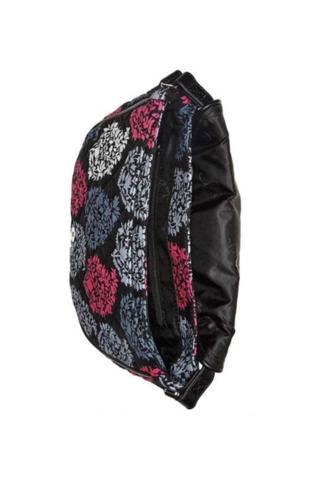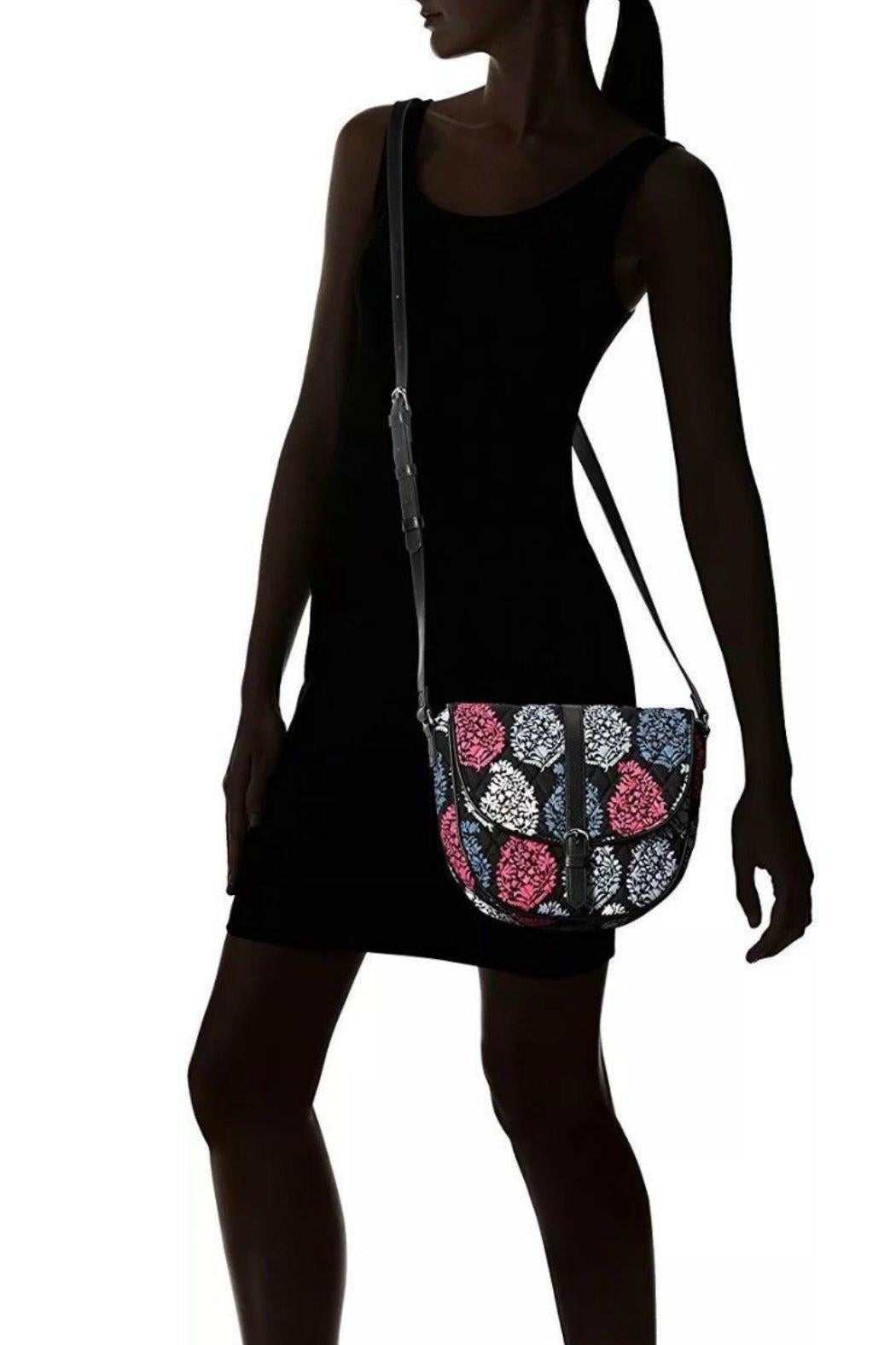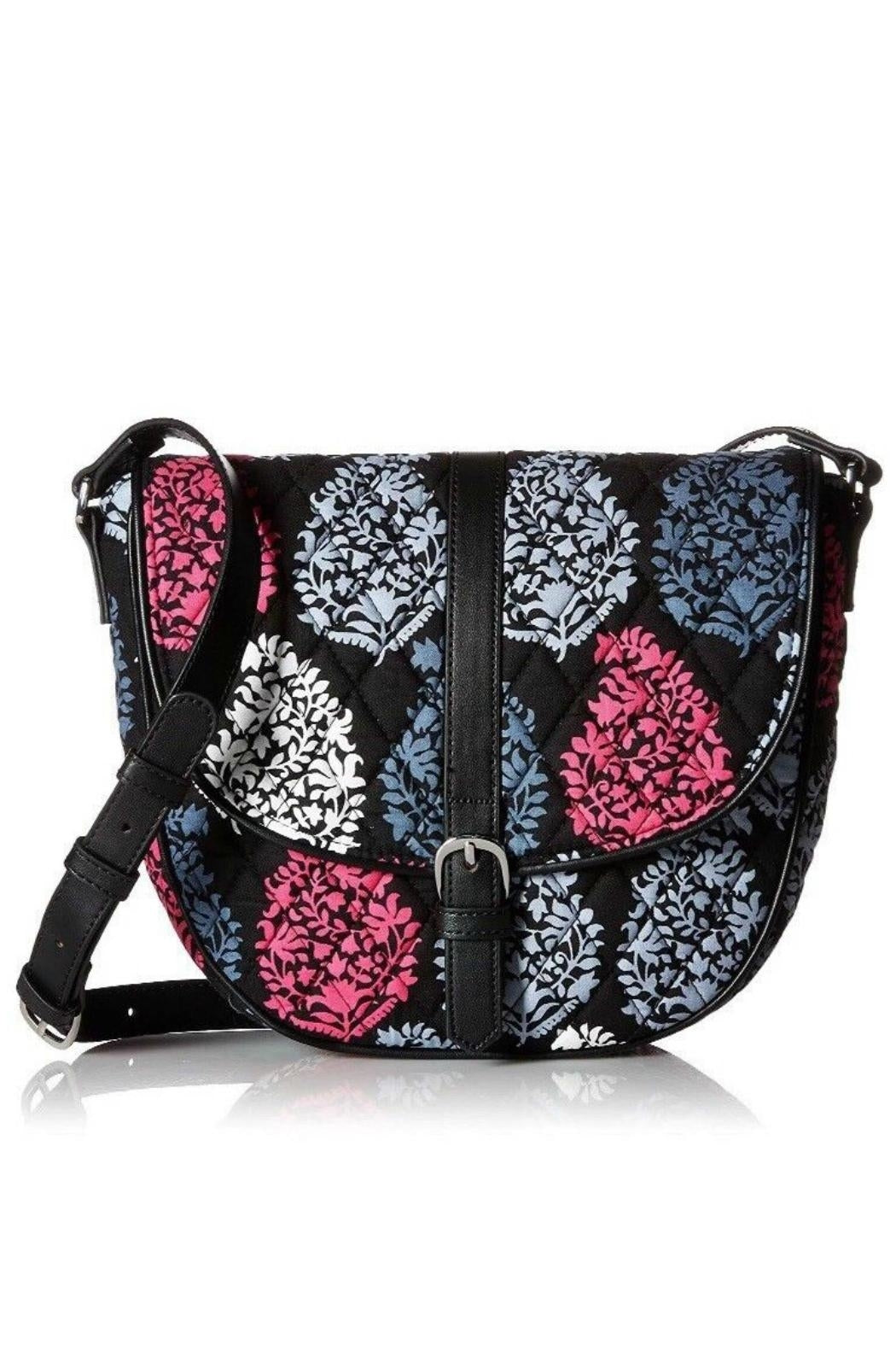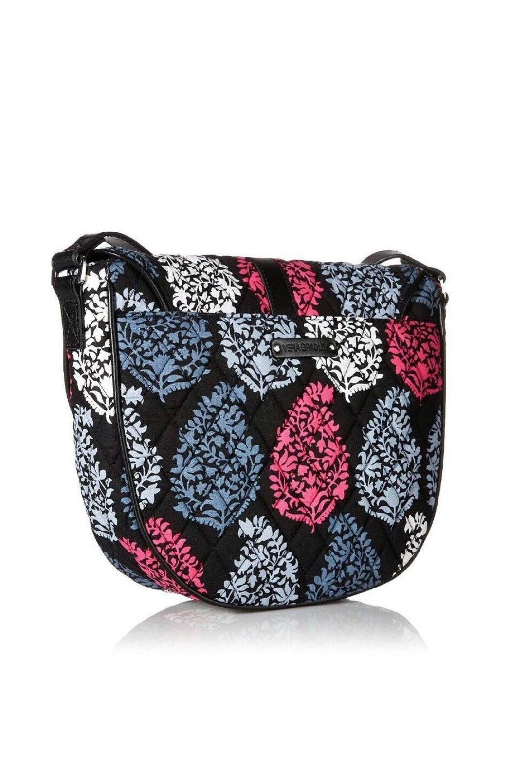 Here is the Vera Bradley Slim Saddle Bag in the Northern Lights pattern. This bag merges an equestrian profile with a metropolitan print to keep onlookers on their toes. The adjustable strap caters to your individual comfort and convenience. It features a lightweight quilted cotton machine-washable design, lined in a black poly satin signature fabric. It has a magnetic snap closure and a large slip pocket under the flap. On the back is a signature imprinted detail and another slip pocket perfect for quick access to your phone. On the inside is one slip and one zip pocket. Vegan leather trim around the front and back of the bag, with an adjustable vegan leather strap. Silver tone hardware and buckle detail on bag and strap. Dimensions: 10'' Wide x 8'' High x 2.75'' Deep with a 56'' adjustable strap.