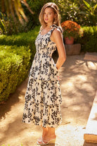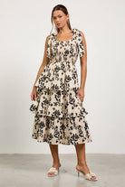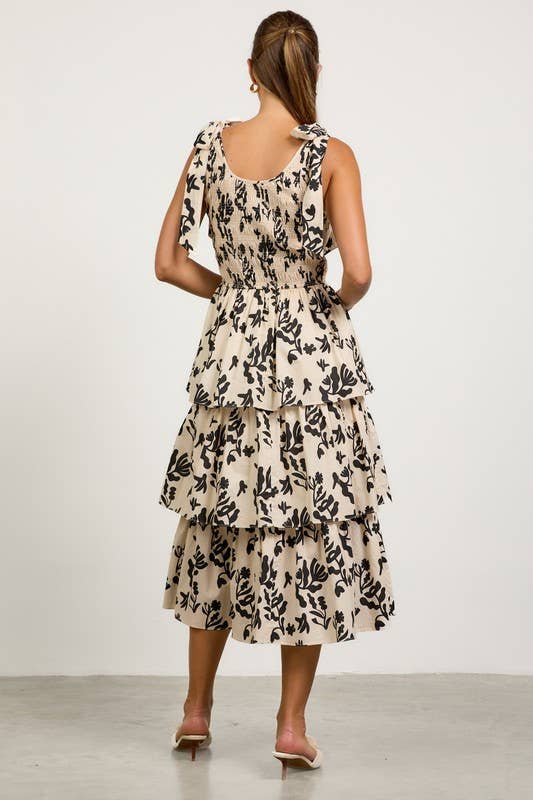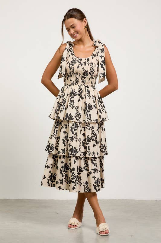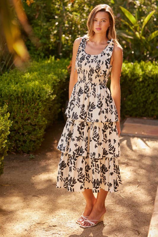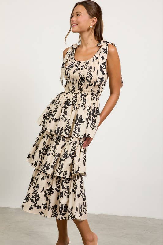 Romantic and playful, this tiered midi dress is perfect for warm-weather occasions. Featuring an allover bold floral print, itβs designed with adjustable tie-shoulder straps, a smocked bodice for a flattering fit, and a multi-layered tiered skirt that adds effortless volume and movement. The scoop neckline and soft neutral tone make it easy to dress up or down.