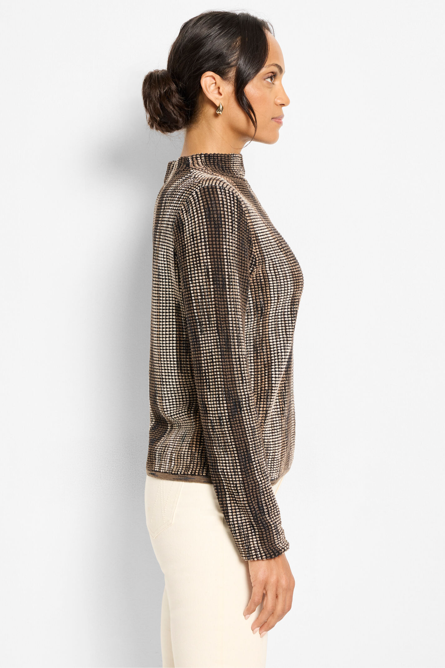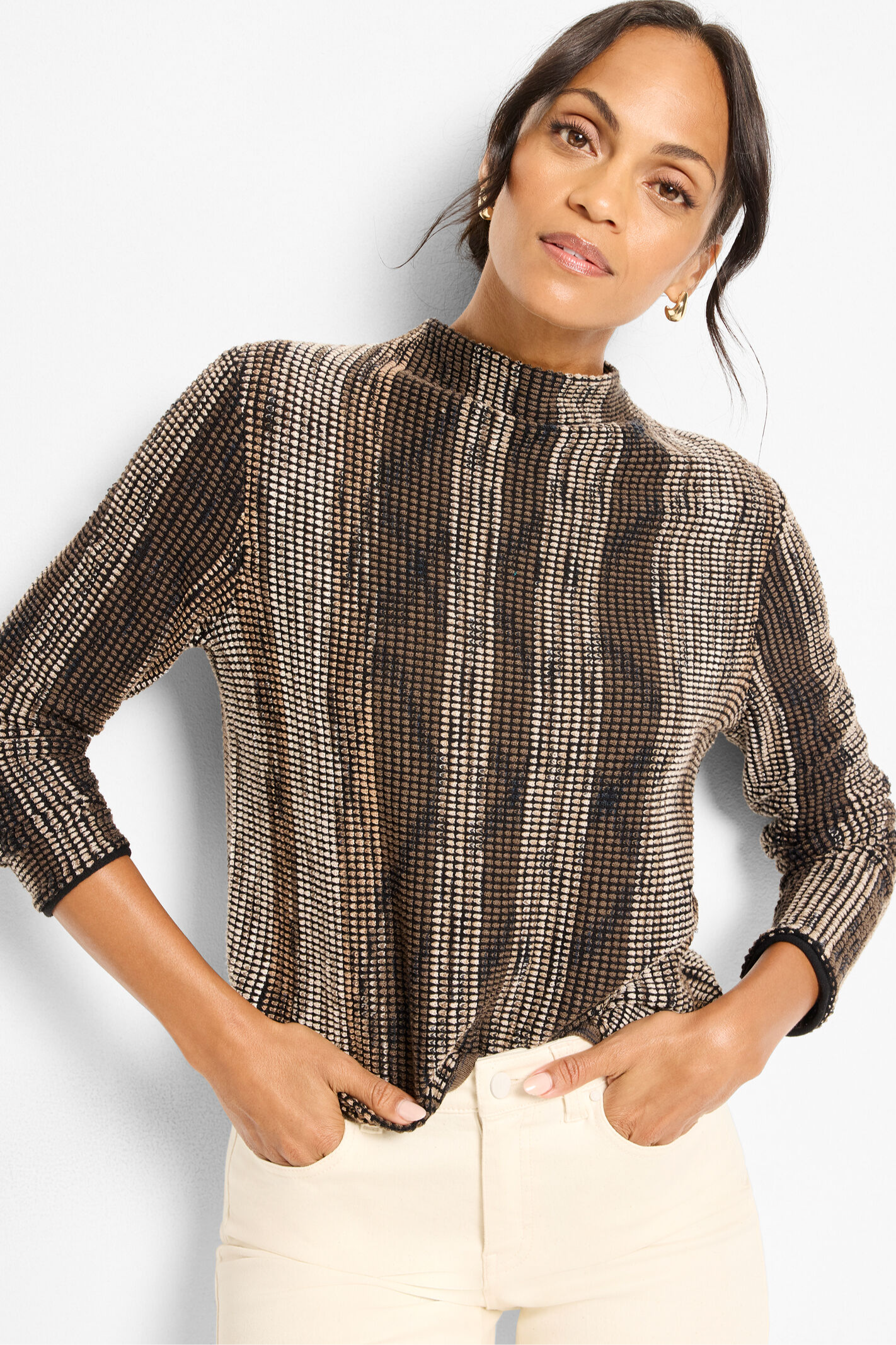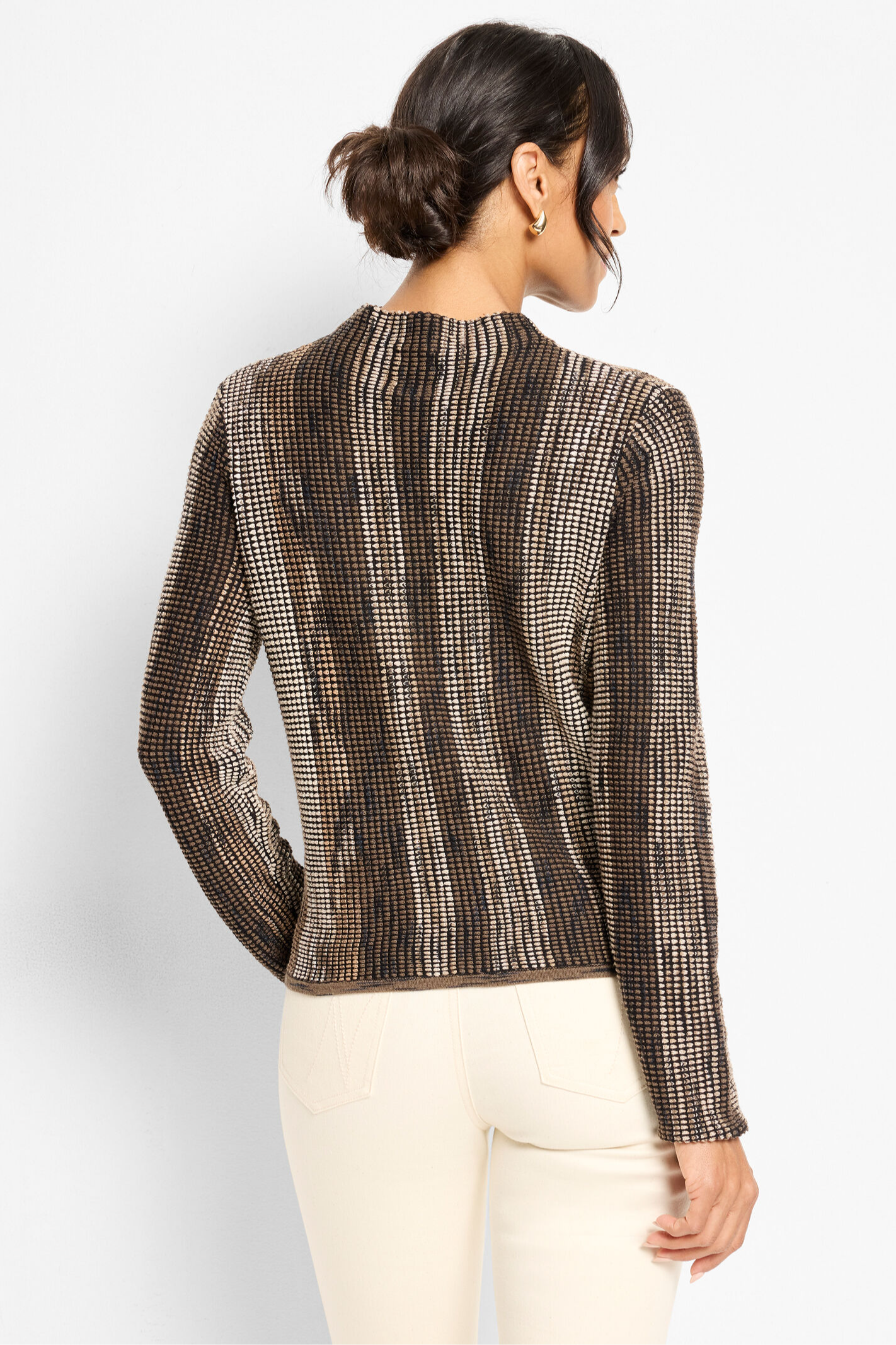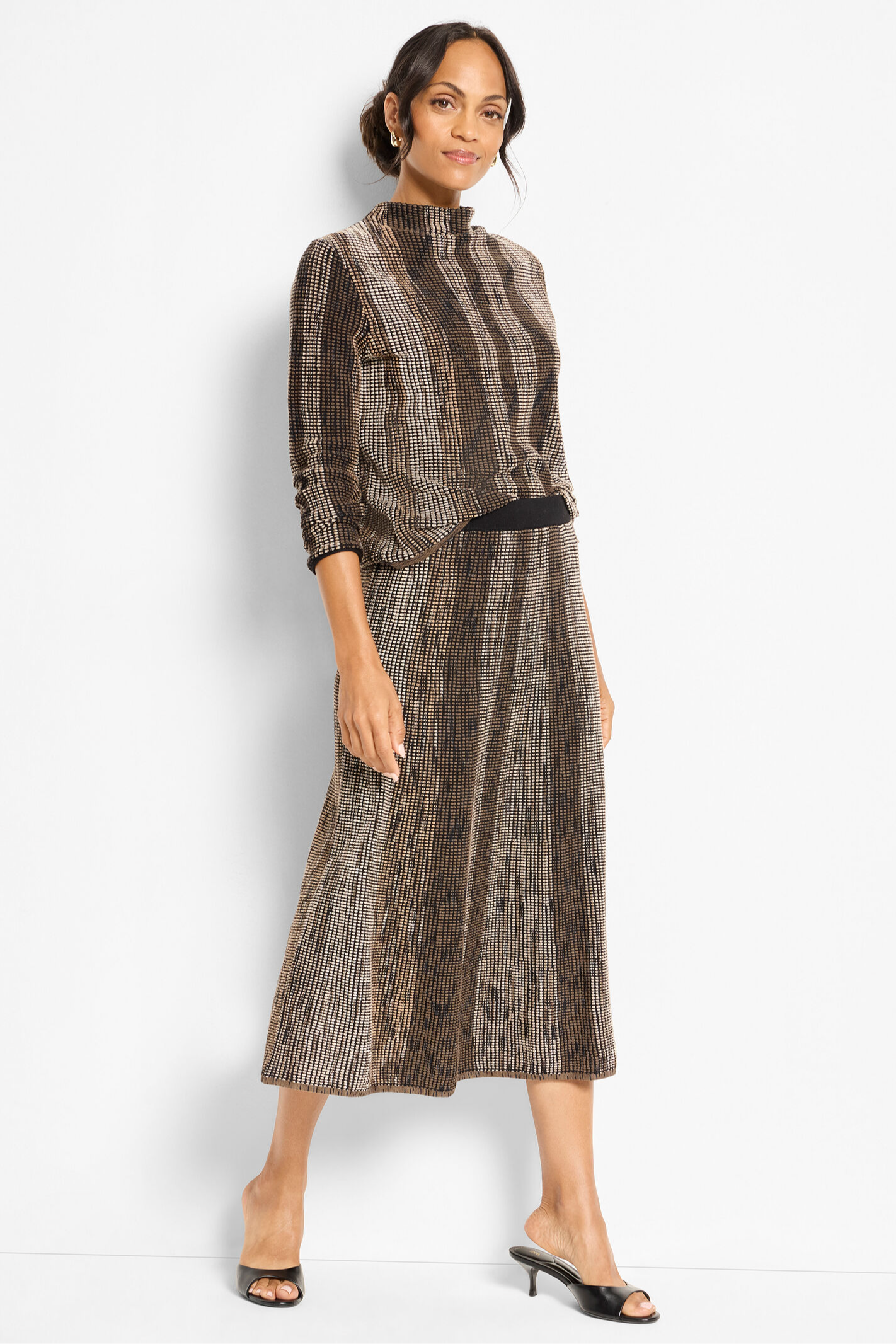 Elegant, sophisticated, and unlike anything else in your closet. Our knit experts went all-in here: combining poppy pixel knit technique and five different kinds of space dye yarn to create the stunningly unique mélange of color and pattern. The funnel neck finish adds one last touch. Wear it with the matching skirt for a chic sweater set. Mindfully Made from fully fashioned knitwear that eliminates textile waste.