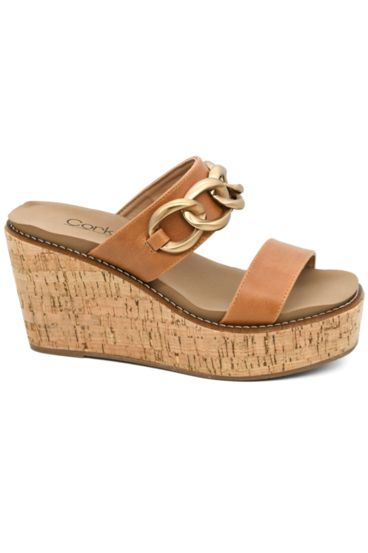Elevate your style with the On Vacay - Cognac by Corkys. These sleek wedges feature gold accents that add a touch of luxury to any outfit. Experience comfort and fashion combined with these must-have shoes.