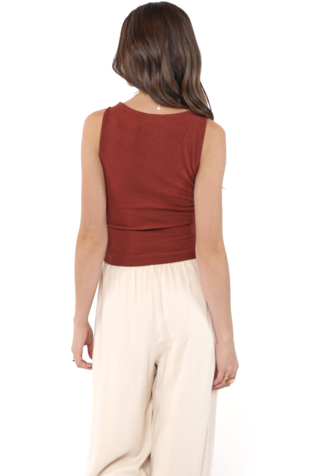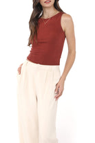 This sleeveless knit top features a sophisticated high neckline and is crafted from a luxuriously soft fabric you’ll want to live in. Designed in a rich Marsala hue, it’s the perfect pop of color for your fall wardrobe. Dress it up with tailored trousers or pair it with denim for an effortlessly chic, season-ready look.