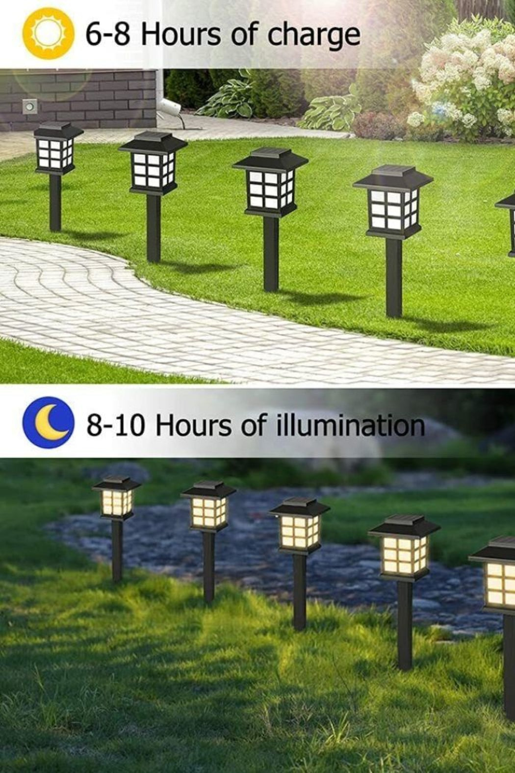 These solar garden lights use high-effciency waterproof solar panels. After solar charging for 6-8 hours during the day, they will automatically turn on at night and continue to light up for 8-10 hours.