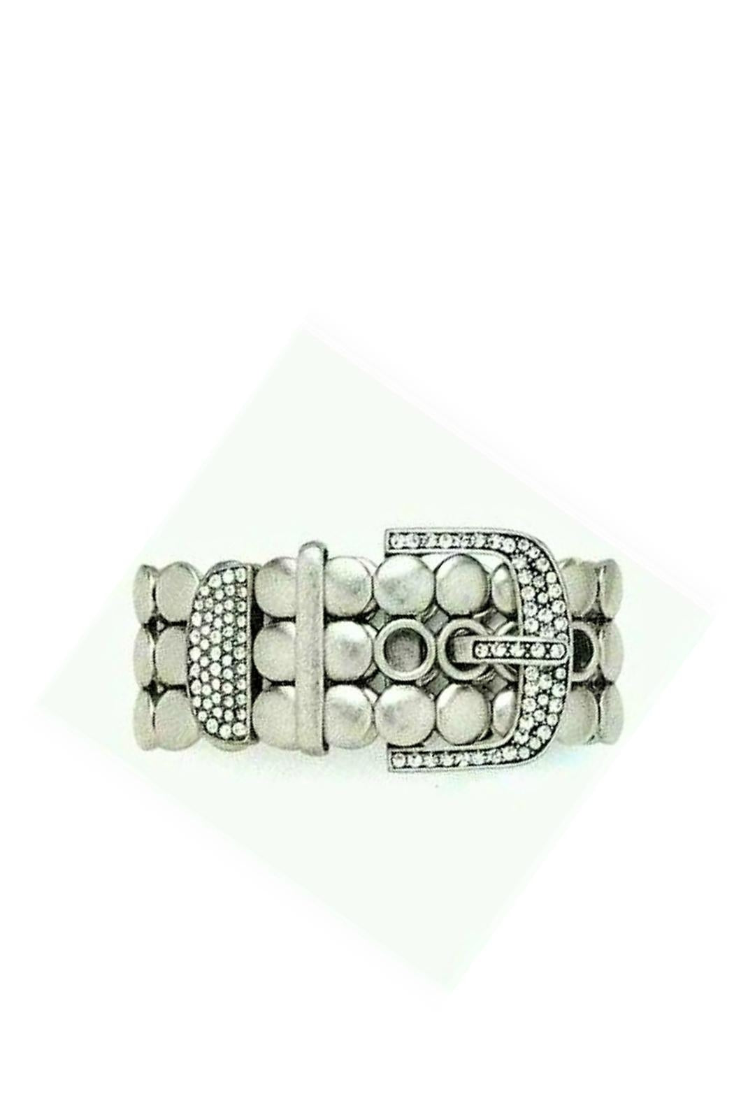This is the Premier Designs Buckle Up Bracelet in matte silver tone finish with lots of crystal accents to make it shine. The bracelet is a bit over 1" wide. It is fully adjustable at the buckle, and you can put it on and off by the buckle, or by simply stretching it on, since it is assembled with elastic. This bracelet is a great piece that will coordinate with just about anything! Find lots of affordable jewelry on the Mimi's Gift Gallery boutique page.