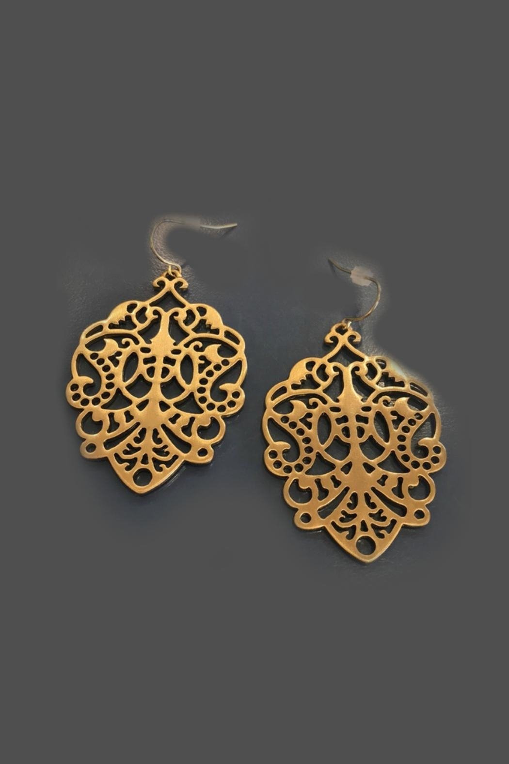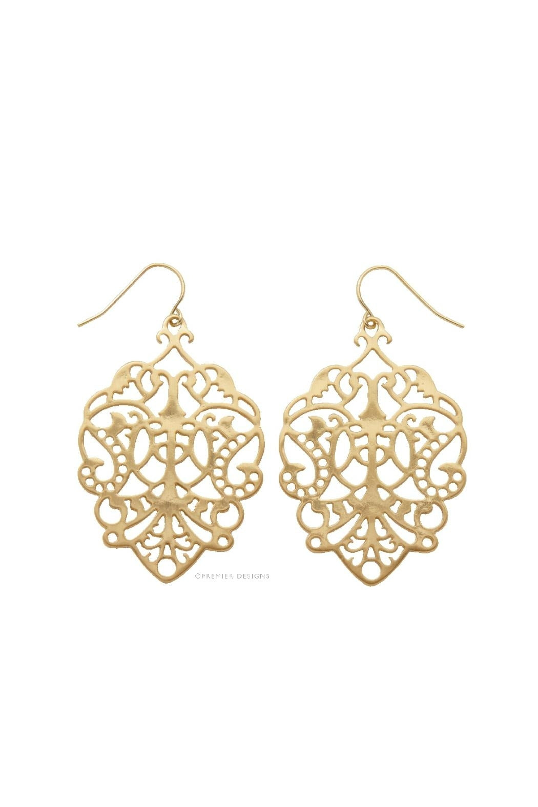 Here are the Premier Design Darcy Earrings in Matte Gold tone. Treat yourself to this very special pair of earrings. Or, treat someone important to you and make them happy! Intricate filigree design with fish hook. These earrings comply with safety regulations of lead, nickel and other components. Comes in boutique gift box. Find many affordable choices in jewelry on the "Mimi's Gift Gallery" boutique page. Dimensions: 2.25" long x 1.25" wide.
