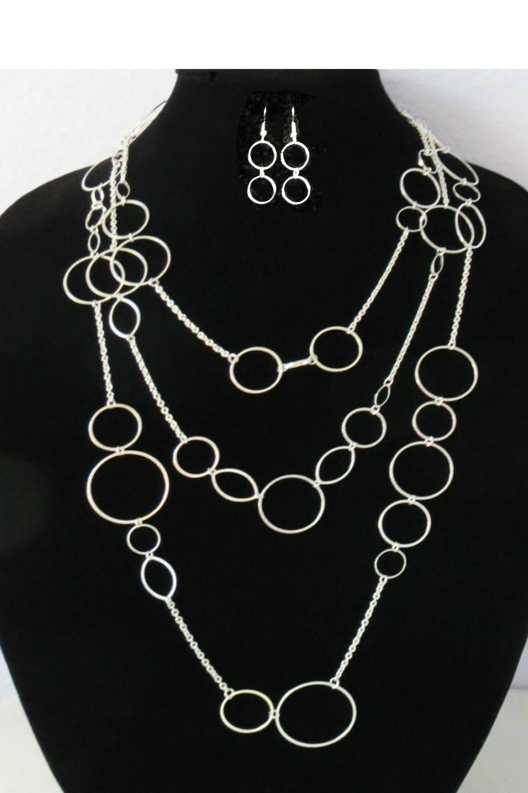 This is the Premier Designs Round And Round Necklace. It has three strands of chain and circular connectors that give it a timeless classic look. The necklace is silver plated . In our workshop, we made matching earrings with fish hooks that are also silver plated and perfectly match the necklace! This set will be your "go-to" set with just about anything you want to wear! Find more moderately priced jewelry on the "Mimi's Gift Gallery" boutique page. Longest chain is approximately 31", shortest 20", and the earrings are 1 3/4" long and 1/2" across.