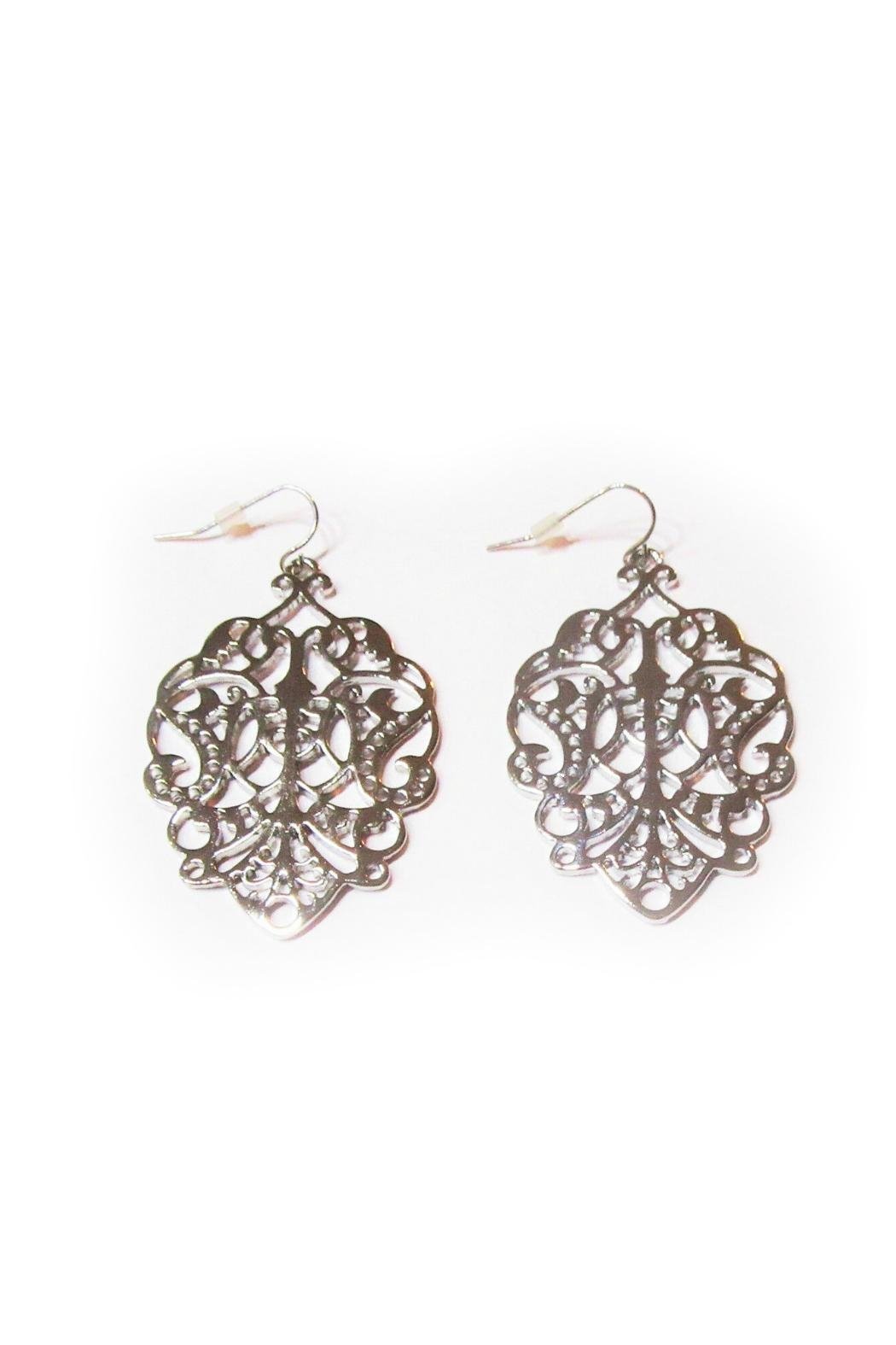 Here are the Premier Design Darcy Earrings in Silver tone. Treat yourself to this very special pair of earrings. Or, treat someone important to you and make them happy! Intricate filigree design with fish hook. Find many affordable choices in jewelry on the "Mimi's Gift Gallery" boutique page. Dimensions: 2.25" long x 1.25" wide.