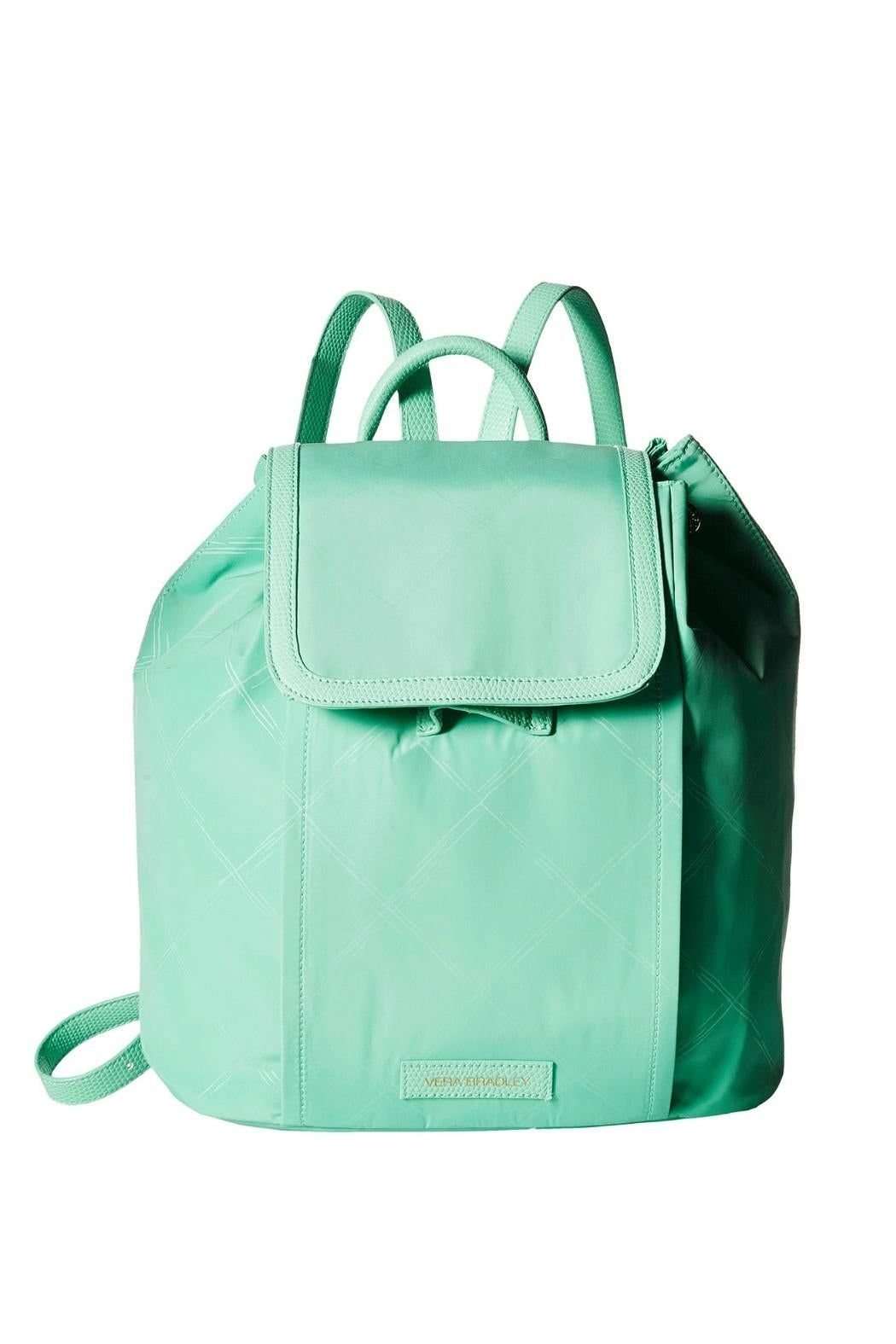 Here is the Vera Bradley Preppy Poly Backpack in the Mint color. Upgrade your casual look with this chic backpack. Made of water repellent polyester, it has a drawstring with magnetic snap closure. Top carrying handle with dual adjustable shoulder straps. Hidden exterior front zip pocket. Signature logo detail in front. Flat base to provide upright structure. Beautiful coordinating print lined interior. Interior back-wall zip pocket. Interior slip pocket. This is a purse-sized backpack not large enough for campus use. Click on "Mimi's Gift Gallery" to find other Preppy Poly bags and accessories. Measurements: Width 11.5 in., Depth 5 in., Height 12 in., Strap Length 30.5 in., Strap Drop 16 in., Handle Drop 2.5 in.