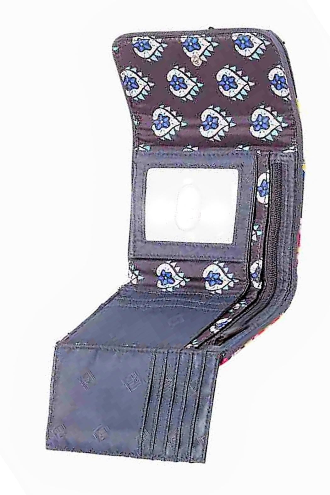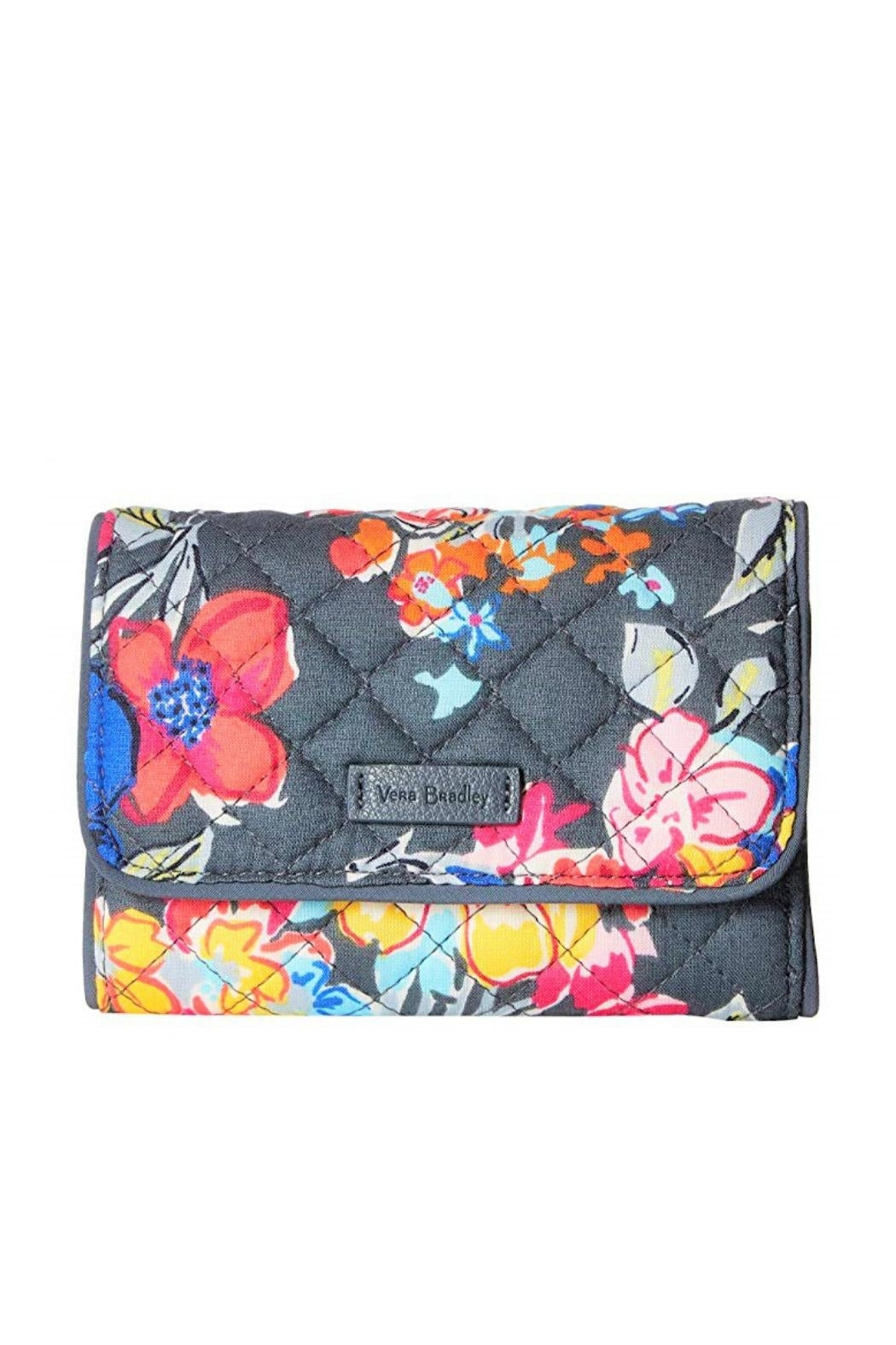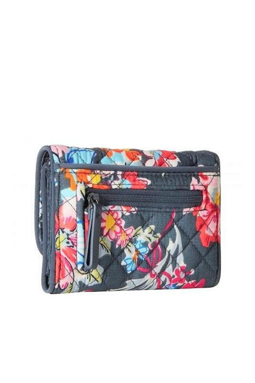 Here is the Vera Bradley Iconic RFID Riley Compact Wallet in the Pretty Posies pattern. This pattern was one chosen by Vera Bradley to be part of the Vera Bradley Foundation for Breast Cancer program, which has raised over $30 million to support critical advancements in breast cancer research. The small but mighty Riley is just right for smaller crossbody and clutch bags! There's plenty of room for cash, cards, coins and your ID. Provides RFID protection for credit and debit cards. Exterior features one slip, and one zip pocket, and two closure snaps to allow for expansion; Interior is lined with a coordinating print poly satin, and features 13 card slips, two bill slips, one ID window and a large zip pocket. Pattern placement will vary making each wallet unique. Click on "Mimi's Gift Gallery" to find other bags and accessories in the Pretty Posies pattern and support breast cancer research! Dimensions are 5 ¼" wide x 4" high x 1 ¼" deep (closed) and 13.25" wide x 5 ¼" high x 1/2" deep