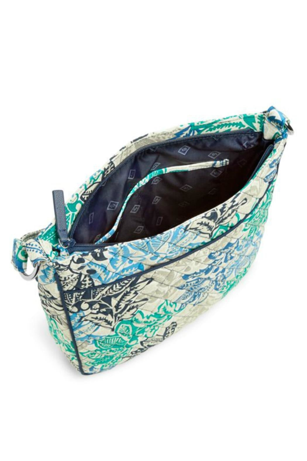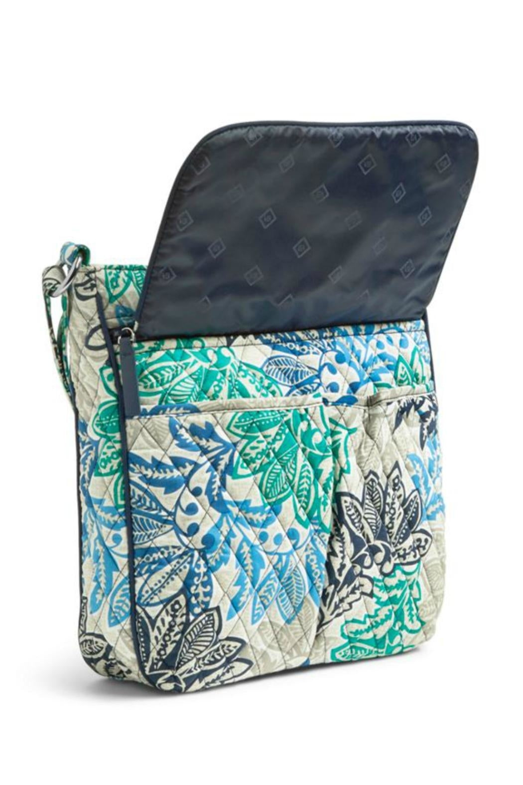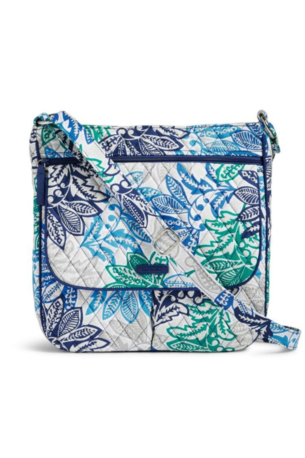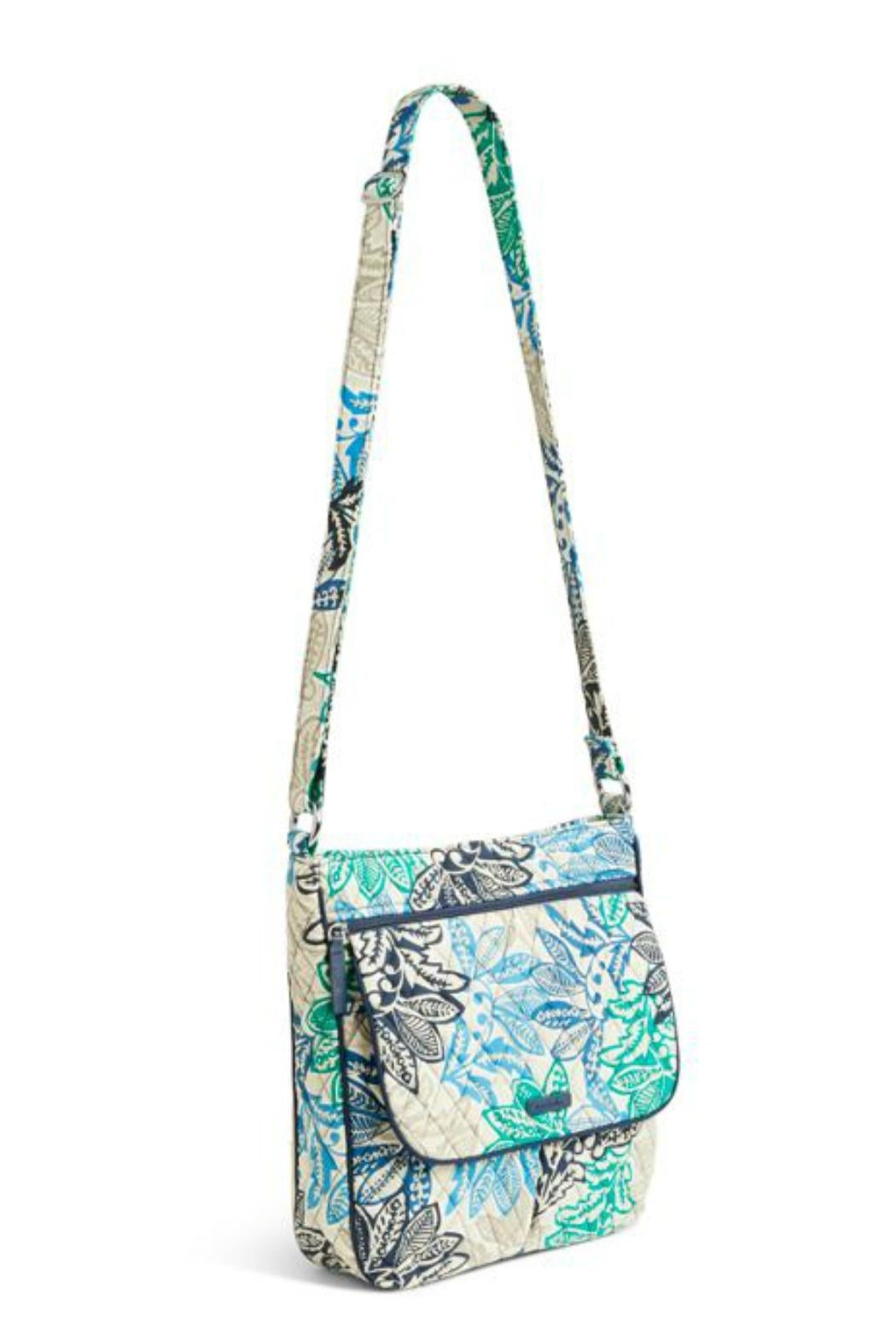 Here is the Vera Bradley Double Zip Mailbag in the Santiago pattern. Exterior features one zip pocket over the flap, two slip pockets under the flap and a slip pocket on the back. Interior features two slips and a zip pocket. Has zip and magnetic snap closures and silver tone hardware. Find other accessories in the Santiago pattern on the "Mimi's Gift Gallery" boutique page. Dimensions: 11 ¼" wide x 11 ½" high x 2 ½" deep; with a 56" adjustable strap