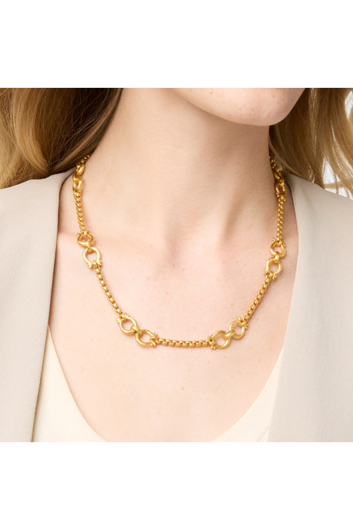 A necklace brimming with equestrian spirit, featuring hand-hammered golden bridle links connected by Venetian box chain, closing with a yoke-shaped toggle.