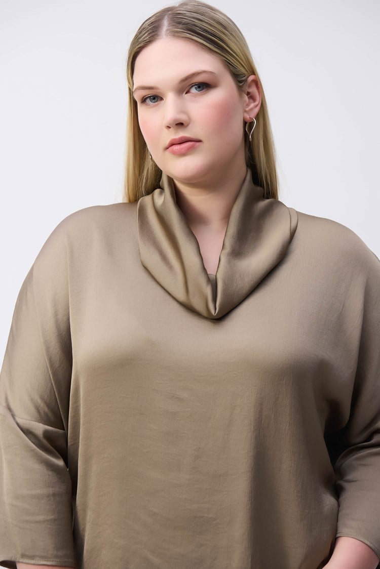 Crafted from lustrous satin, this top exudes a rich appeal that speaks volumes of your refined taste. The unique high-low cut and the detail of the faux placket add a contemporary twist, while the cowl neck and buttoned long sleeves enhance its sophistication. Perfect for any occasion, this flared top seamlessly transitions from office chic to evening glamour.