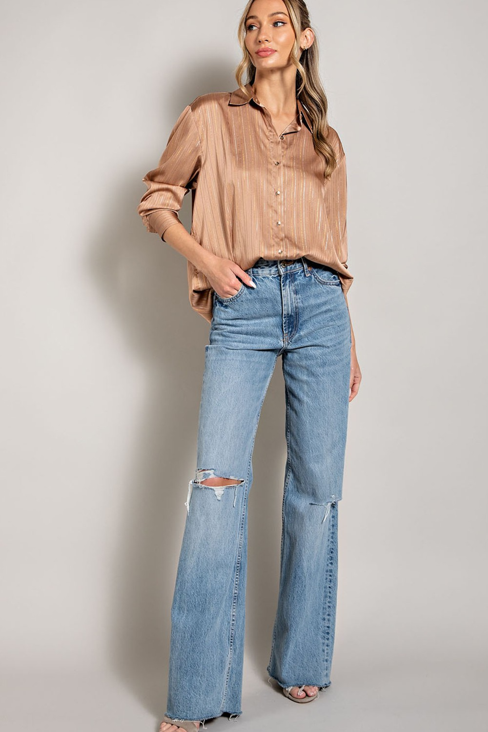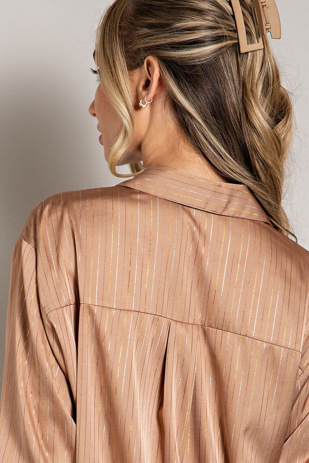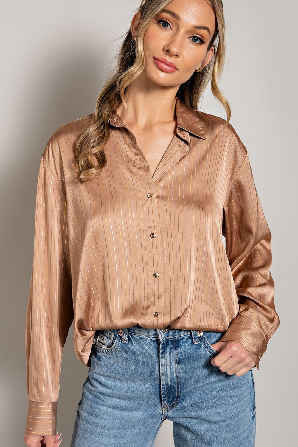 Classy satin striped button down top featuring buttoned cuffs and collar. Cute top perfect for work attire!