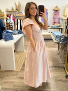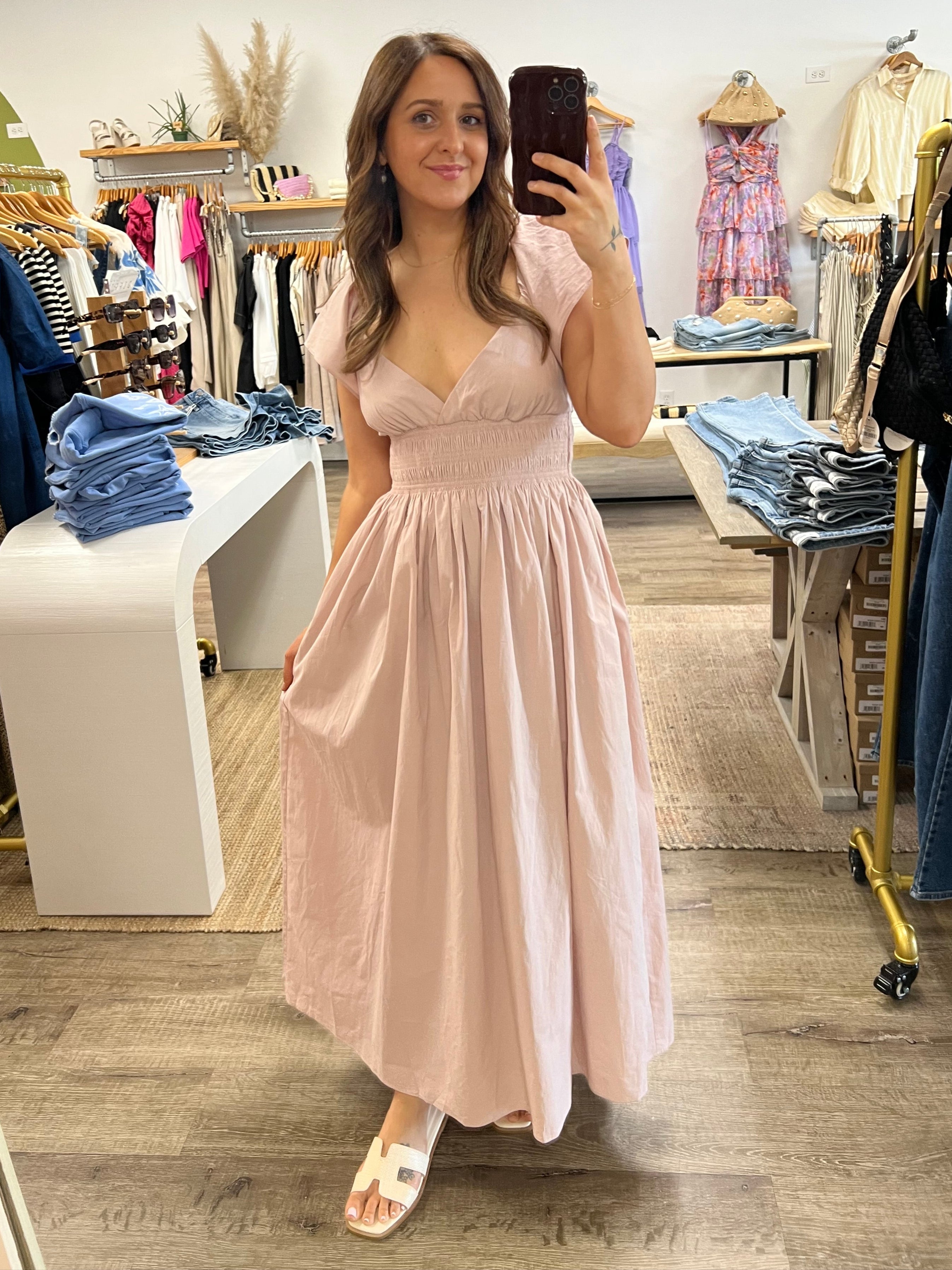 Look effortlessly chic in our Sawyer Midi Dress! This light mauve dress features a flattering V-neck, short sleeves, and ruching in the midline for a slimming effect. The flowy bottom adds a touch of elegance, and the best part? It has pockets! Perfect for any occasion.