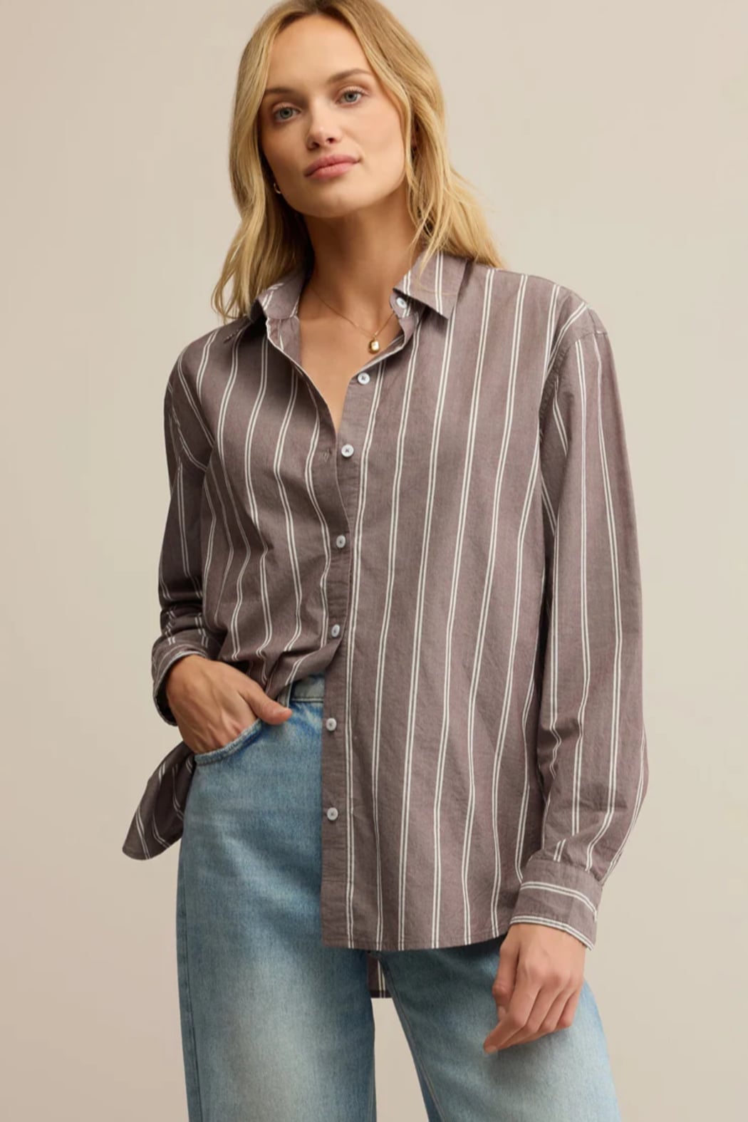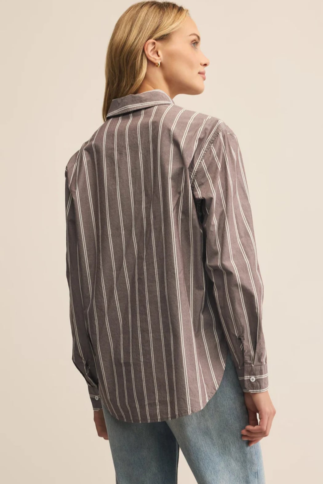 Classic meets coastal in the Seaport Striped Poplin Shirt by Z Supply. This timeless button-down is crafted from crisp, lightweight cotton and features a relaxed, oversized fit for effortless layering. The subtle washed gray and white stripes offer a modern twist on the nautical style, while the drop shoulders and curved hem add just the right amount of drape and movement. Whether worn open over a tank or tucked into your favorite denim, it’s your go-to piece for laid-back polish.